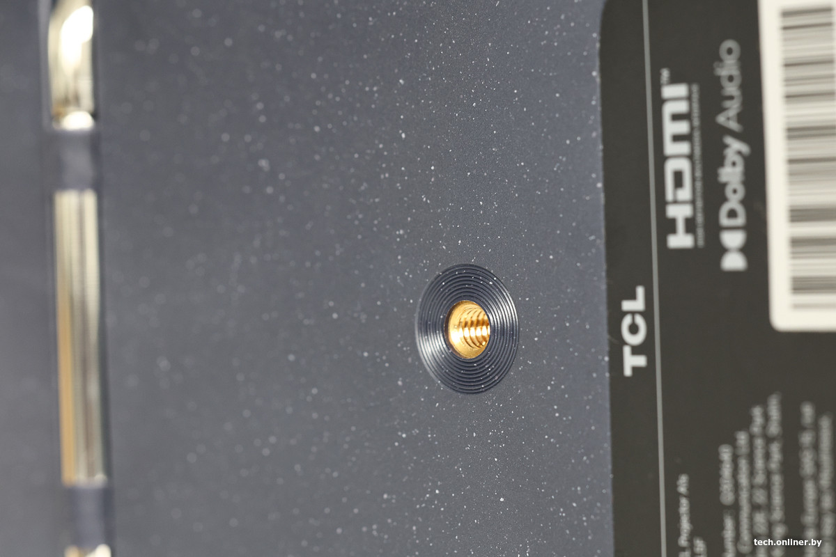 Из корпуса TCL A1S сверху торчит металлическая ручка: она нужна, чтобы достать проектор из кейса и для переноски. Она же становится упором, когда переднюю часть девайса требуется поднять выше (уклон до 15 градусов). Прямоугольной формы, она утапливается сверху и выходит снизу, здесь пара колечек из того же материала, что и задний упор.