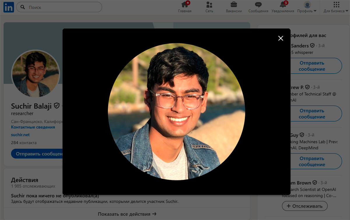 В OpenAI Сучир Баладжи, следует из его профиля в LinkedIn, пришел в ноябре 2020 года, еще до того, как завершил учебу в Калифорнийском университете в Беркли. До получения должности в фирме Сэма Альтмана Баладжи успел поработать на полную ставку в Quora в качестве инженера-программиста, а затем проходил стажировку в компаниях, специализирующихся на разработке алгоритмов искусственного интеллекта: Scale AI, Helia и в той же OpenAI. Кроме того, Баладжи успел засветиться и в ряде конкурсов и соревнований по программированию, занимая призовые места. Можно сказать, что создается образ одаренного, целеустремленного профессионала, пробивающего себе дорогу умениями и подготовкой.