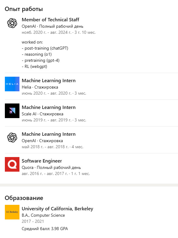 Стажировка в OpenAI стала первой из череды, однако именно в эту компанию программист устроился в итоге спустя несколько лет. И здесь он тоже быстро оказался на хорошем счету среди коллег: его называли одним из наиболее продуктивных и сильных сотрудников отдела, заведующего развитием ChatGPT (на старте парень занимался проектом WebGPT, это вариант GPT-3, трансформировавшийся потом в SearchGPT).
