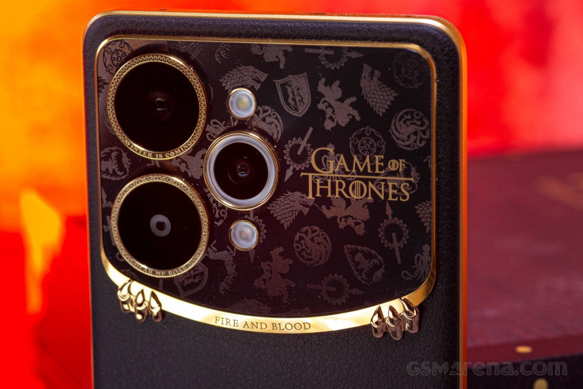 Задняя панель телефона отделана веганской кожей, а посередине находится объемный символ Таргариенов, который виден сквозь чехол благодаря небольшому вырезу. Рядом с объективами камер изображены символы всех домов, а под ними выгравирован девиз дома Таргариенов: «Огонь и кровь».