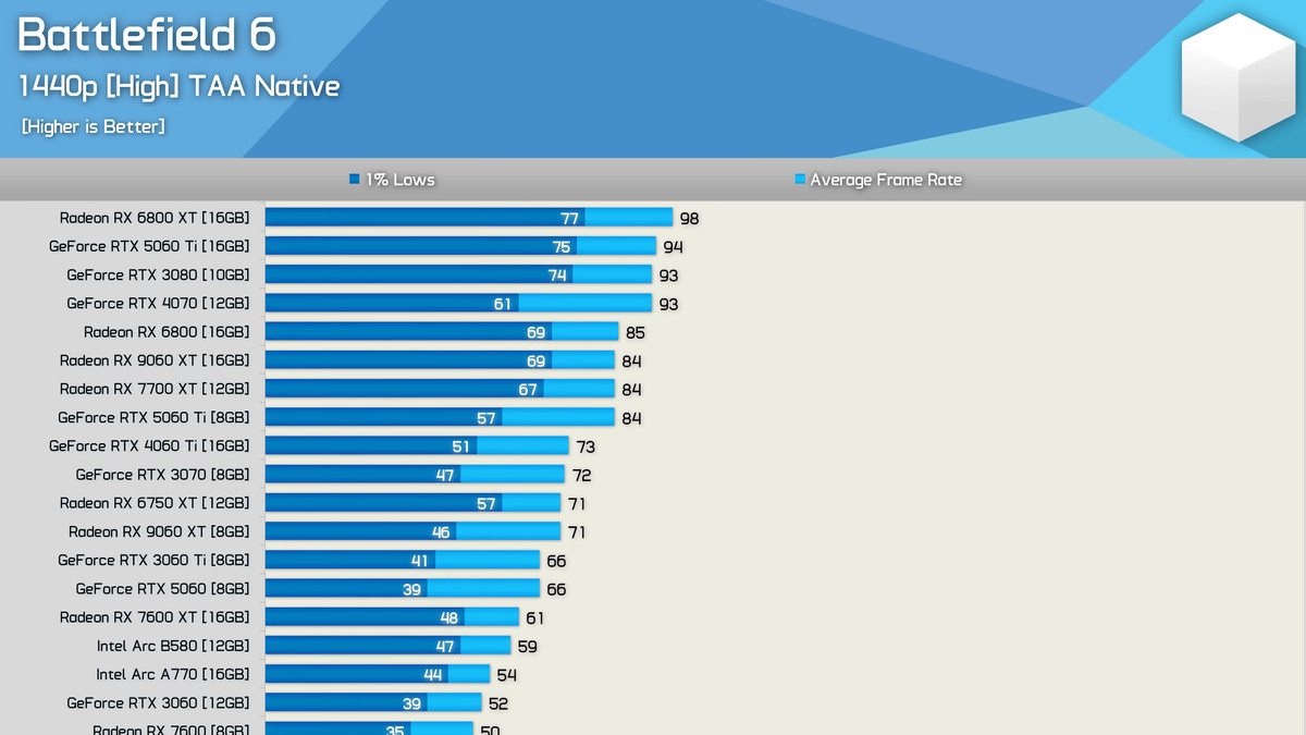 Топ видеокарт для стабильного фреймрейта в FHD в Battlefield 6 выглядит так: