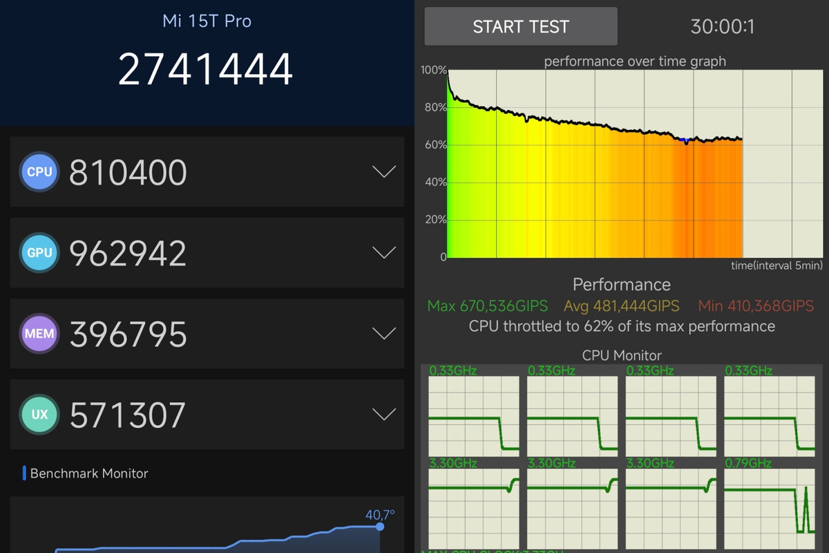 Радует одно: «бытовые» задачи — мессенджеры, клиенты банков, соцсети — оставляют устройство относительно холодным. Да и бенчмарк на троттлинг (100 потоков/30 минут) девайс смог завершить, не показав предупреждения о перегреве.