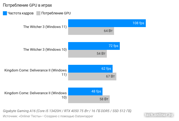 Мы связываем это с пониженным лимитом питания в Windows 10: в «Ведьмаке 3» видеокарта RTX 4050 на более старой системе потребляла на 10 Вт меньше, что заметно снизило производительность.