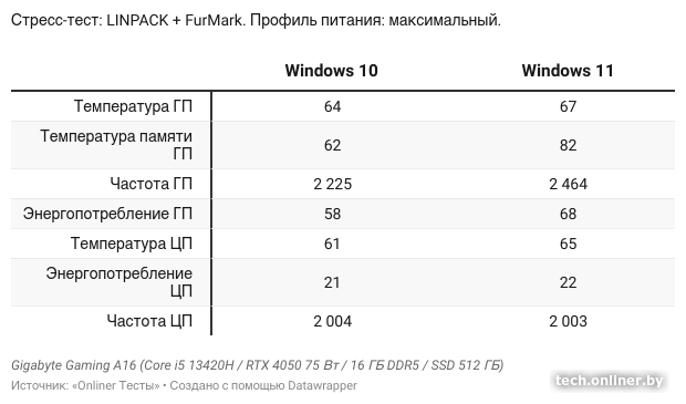 В Windows 11 в стресс-тесте среднее энергопотребление видеокарты в ноутбуке составило 68 Вт. На более старой системе результат был значительно меньше — всего 58 Вт. Этот параметр напрямую влияет на производительность. Меньшее значение в Windows 10 связано с отсутствием поддержки фирменного ПО Gigabyte, которое позволяет расширить лимиты питания.
