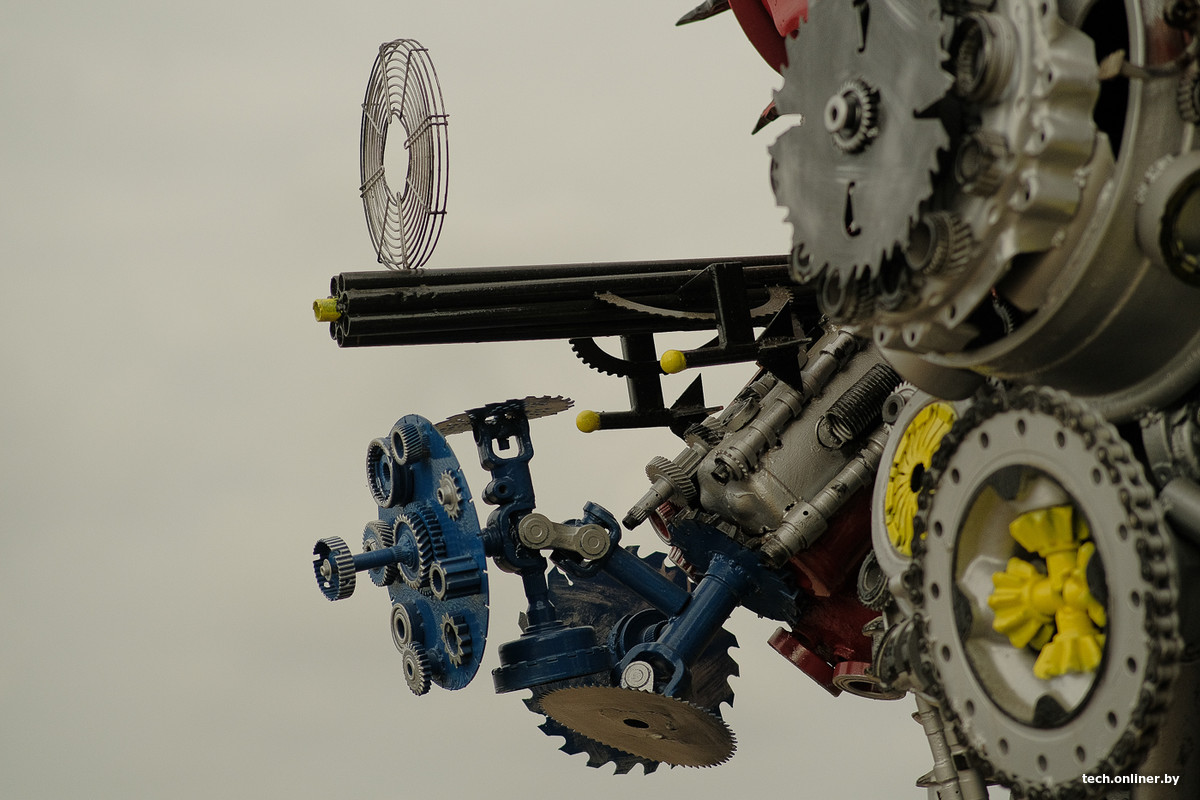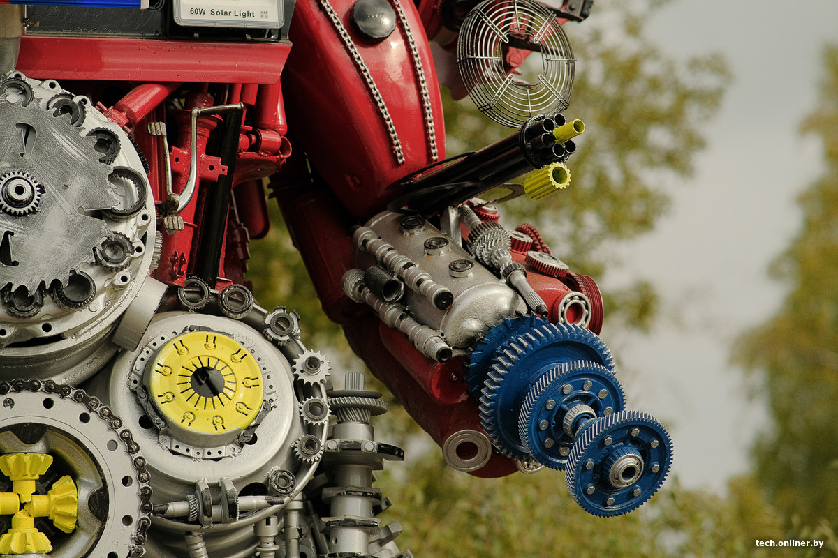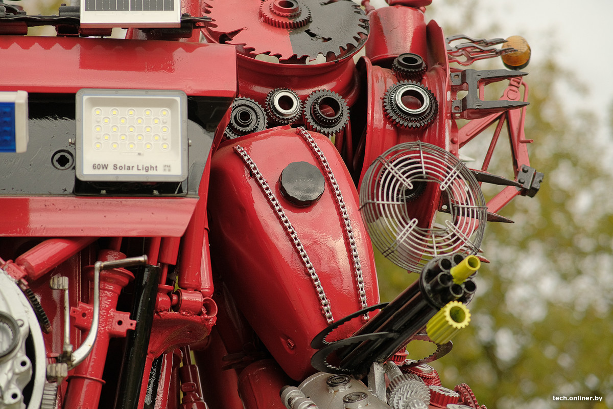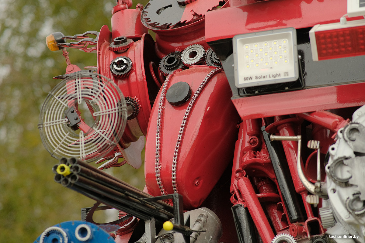 Из основных элементов, которые применялись для робота, мужчины называют корзины сцепления, бензобаки от мотоцикла — они имитируют бицепсы автобота, шестеренки от коробок передач, пружины амортизаторов, распределительные и коленчатые валы и даже огнетушители.
