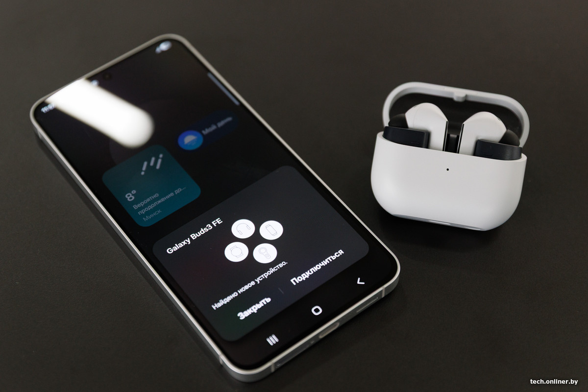 • В активе защита по стандарту IP54 — но только для самих наушников, без футляра. По идее, выйти из строя из-за слабого дождя/пота Buds 3 FE не должны. Проверять, ка обычно, не рекомендуем.