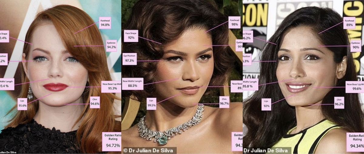 Так, в интерпретации Де Сильва, Эмма Стоун — самая красивая женщина в мире. Она, если верить заметке, соответствует принципу «золотого сечения» на 94,72%. На второй позиции, по статье, Зендея (94,37%), на третьем месте — Фрида Пинто (94,34%).