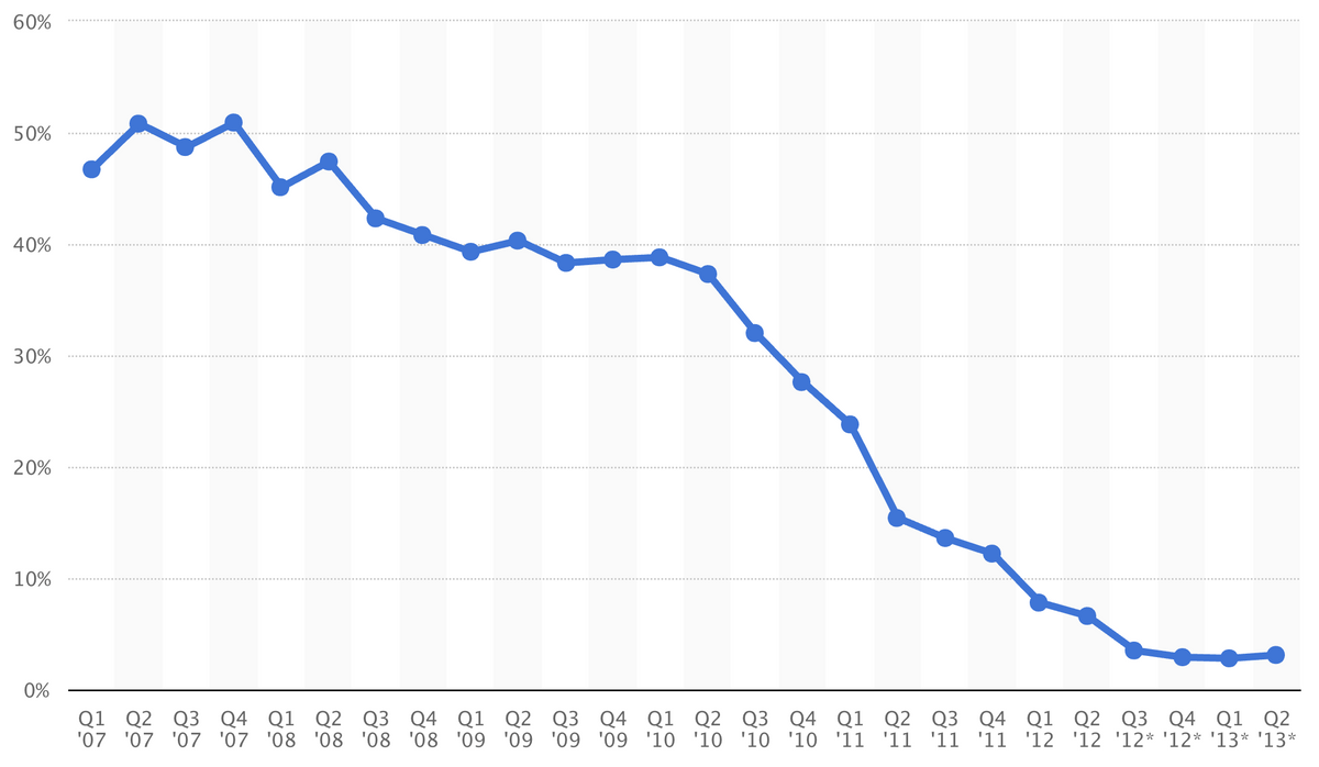 Доля Nokia на мировом рынке мобильных телефонов в период с 2007 по 2013 год