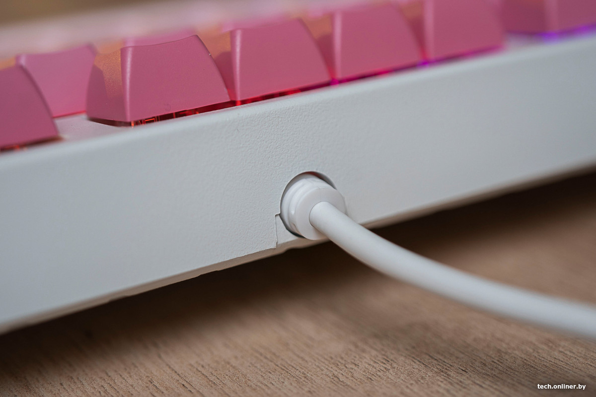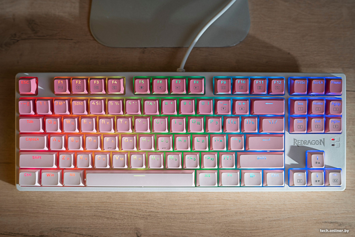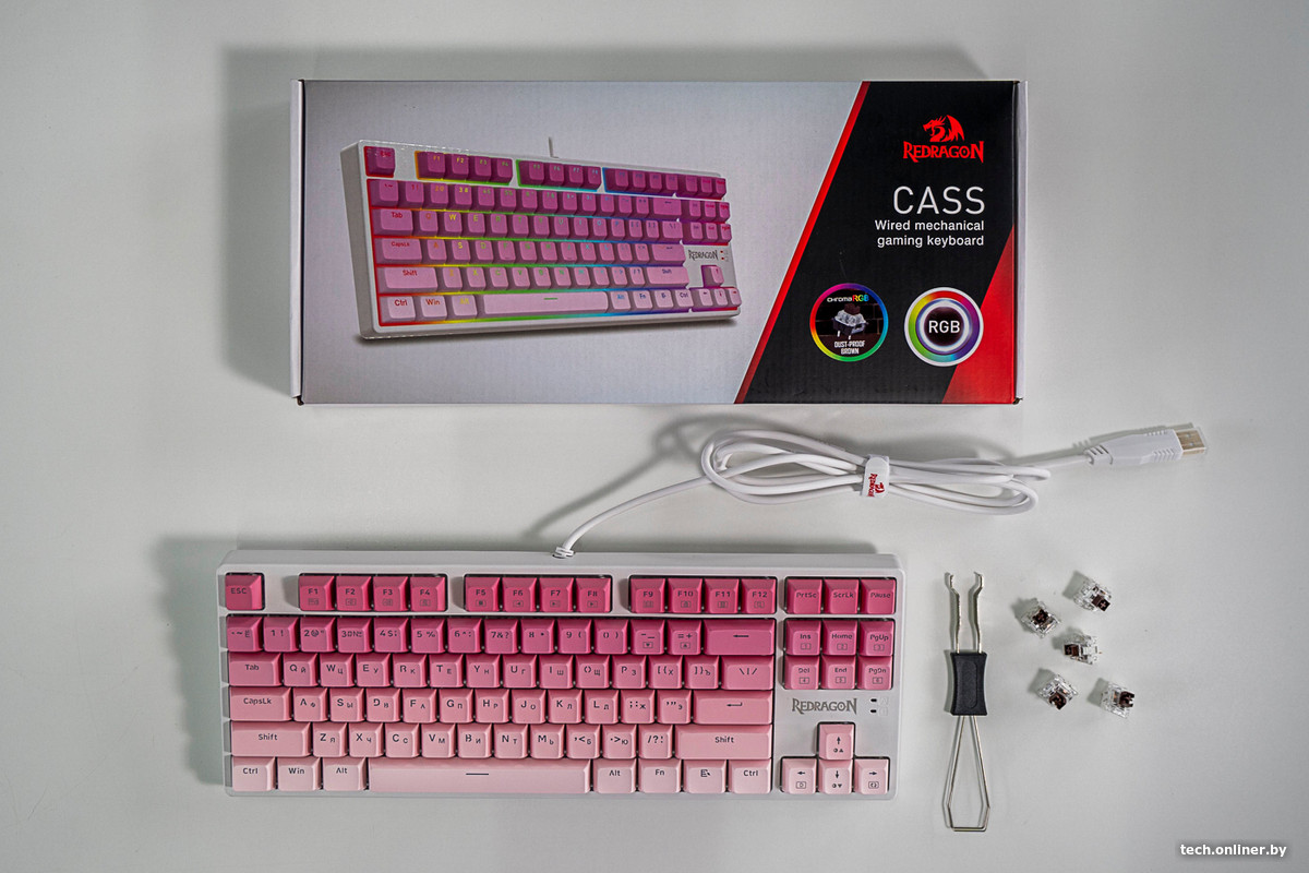 Redragon Cass зацепила своим кричащим розовым цветом. Клавиатура выполнена в типоразмере TKL— без цифрового блока. Клавиши имеют регулируемую RGB-подсветку. Redragon Cass — единственная клавиатура на обзоре с встроенным кабелем подключения к ПК.