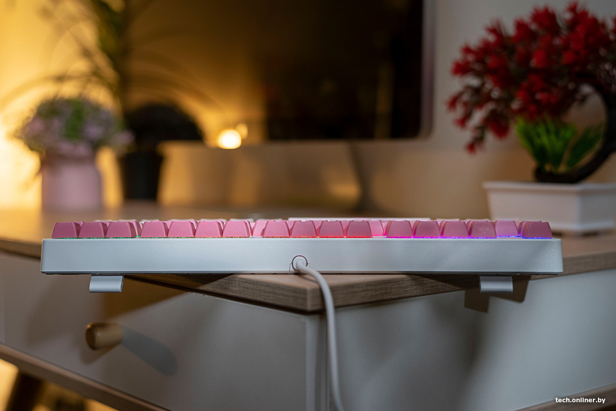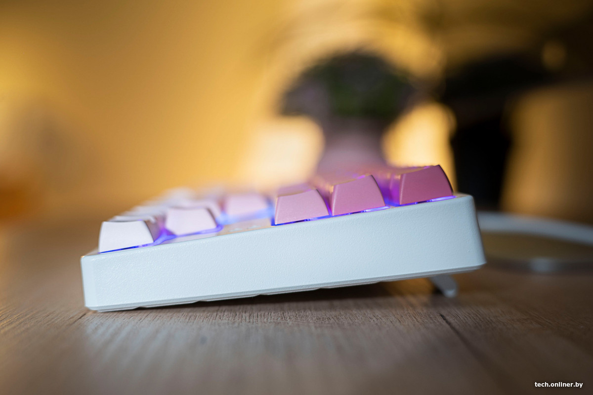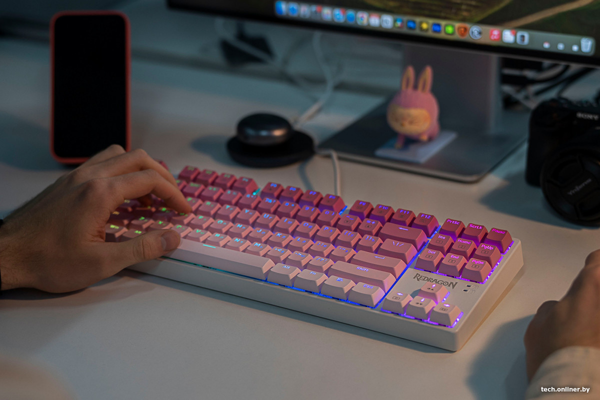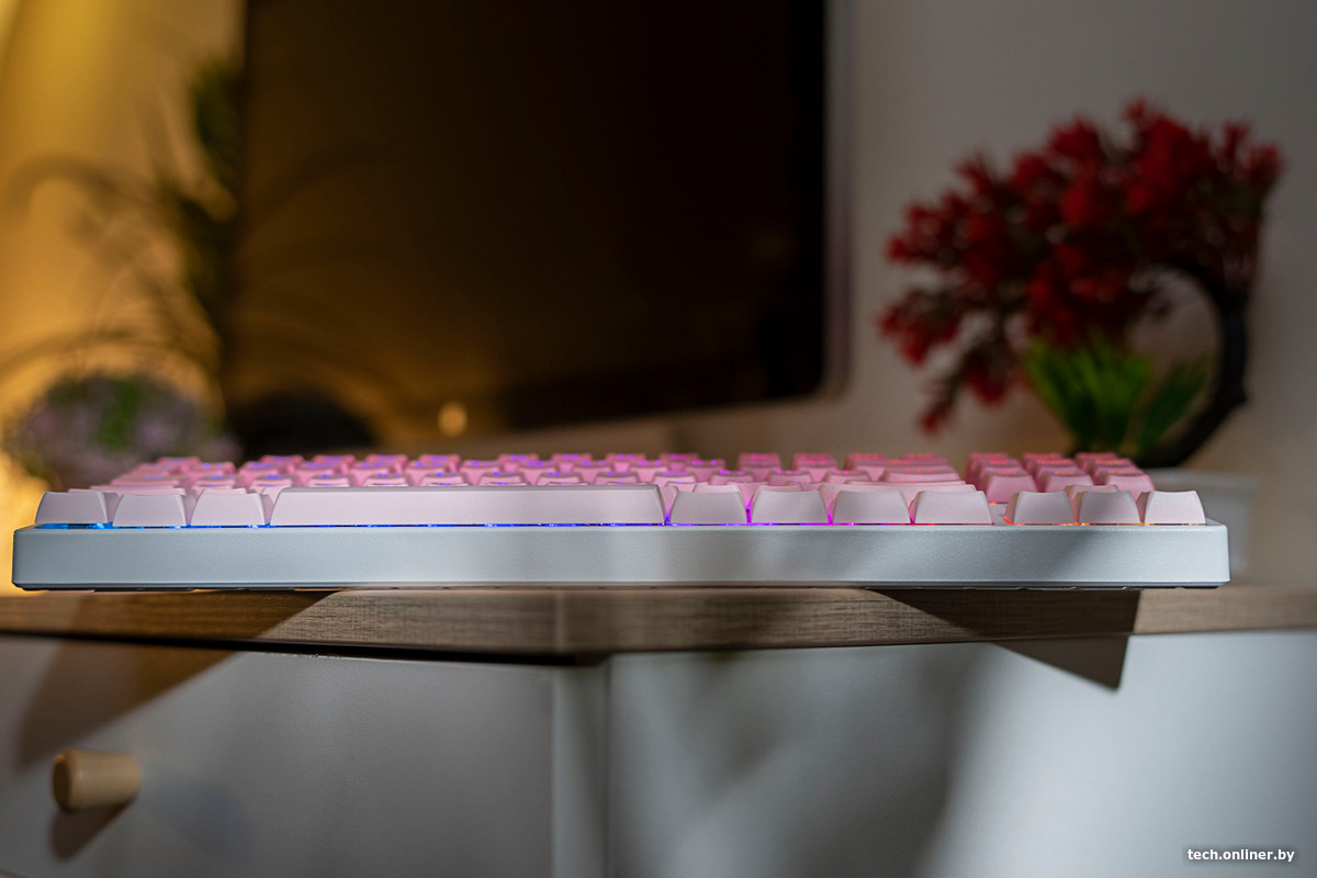 Redragon Cass зацепила своим кричащим розовым цветом. Клавиатура выполнена в типоразмере TKL— без цифрового блока. Клавиши имеют регулируемую RGB-подсветку. Redragon Cass — единственная клавиатура на обзоре с встроенным кабелем подключения к ПК.