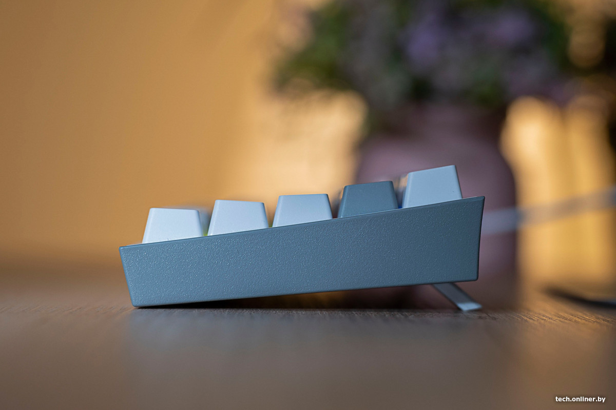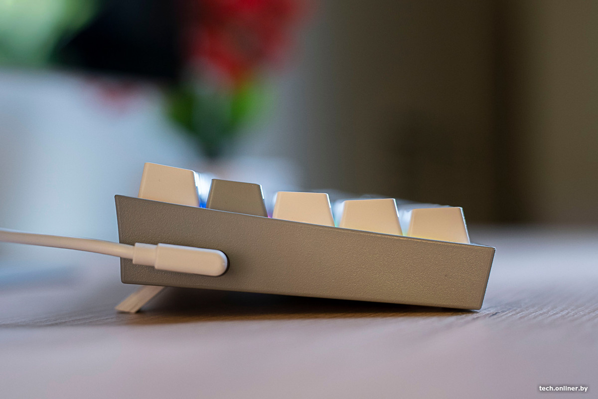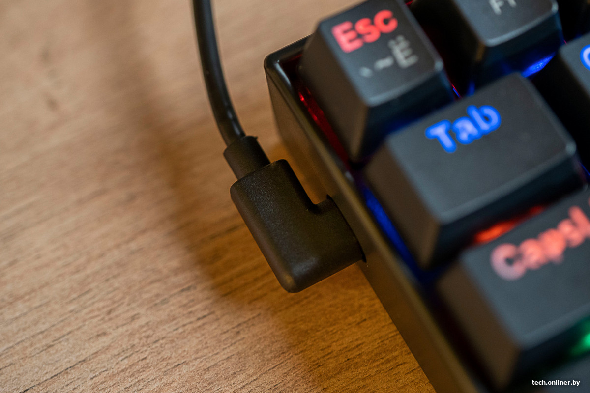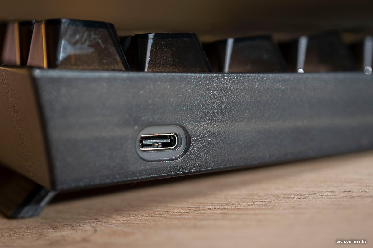 Профиль клавиатуры довольно высокий: расстояние от стола до верхней части клавиши Enter — 26 мм. С выдвинутыми ножками для регулировки угла высота увеличивается до 35 мм. Устройство подключается к ПК по кабелю через интерфейс Type-C.