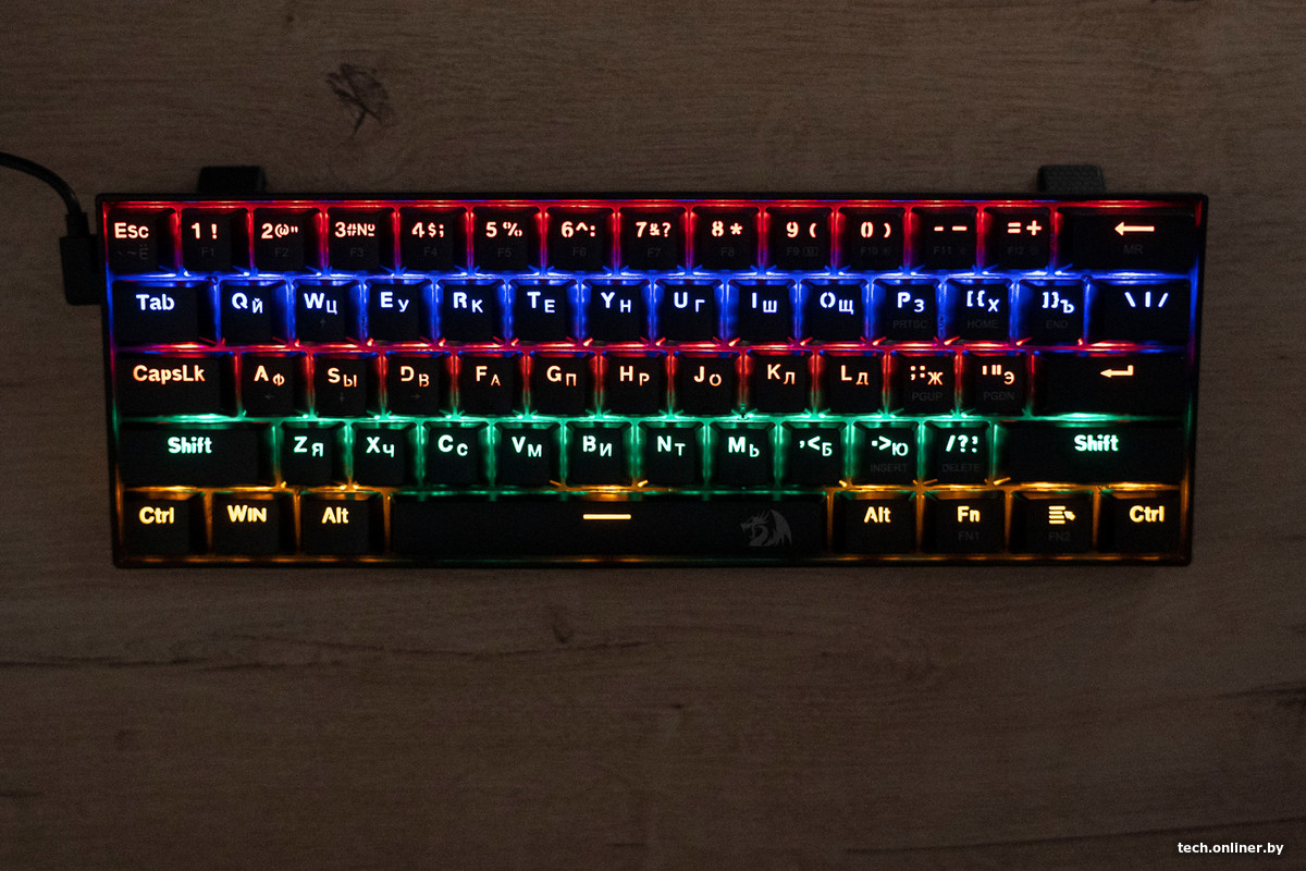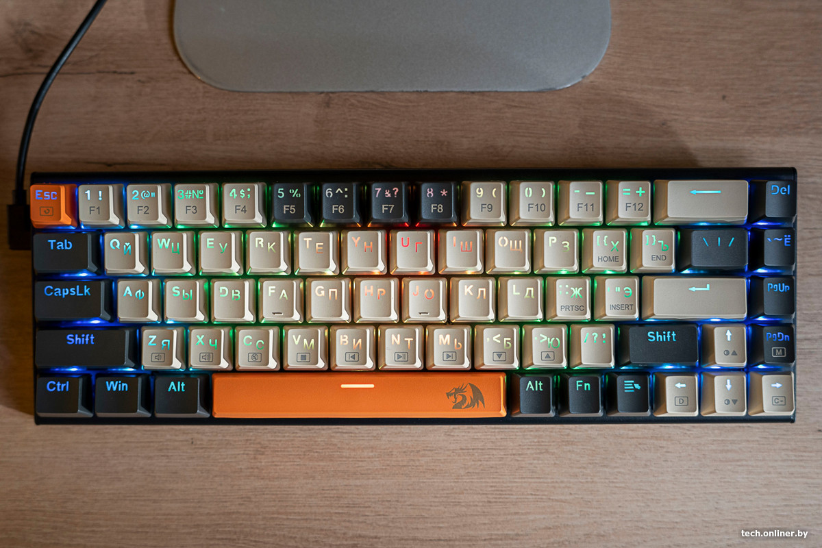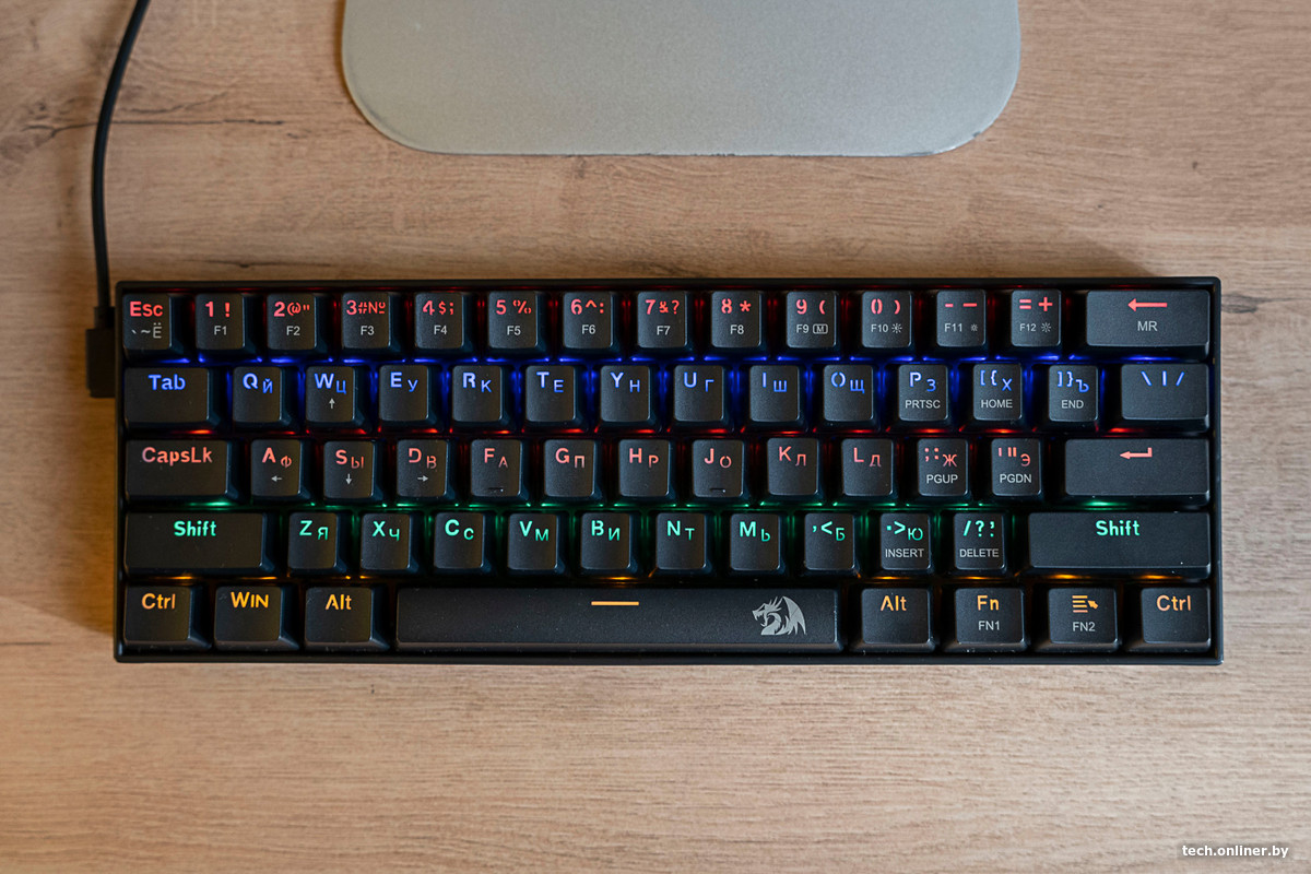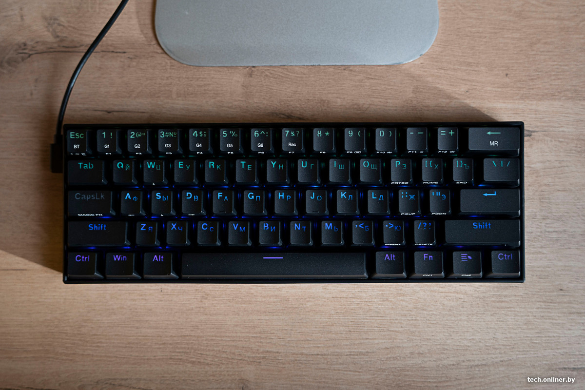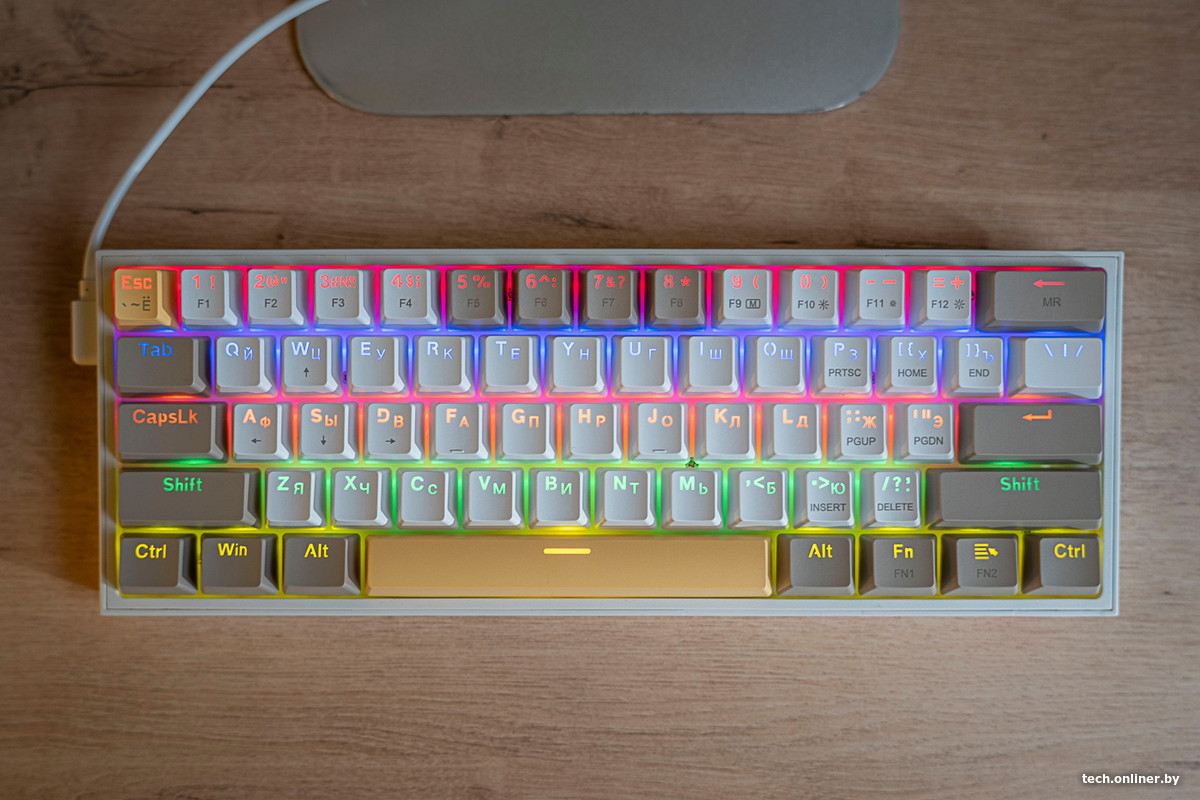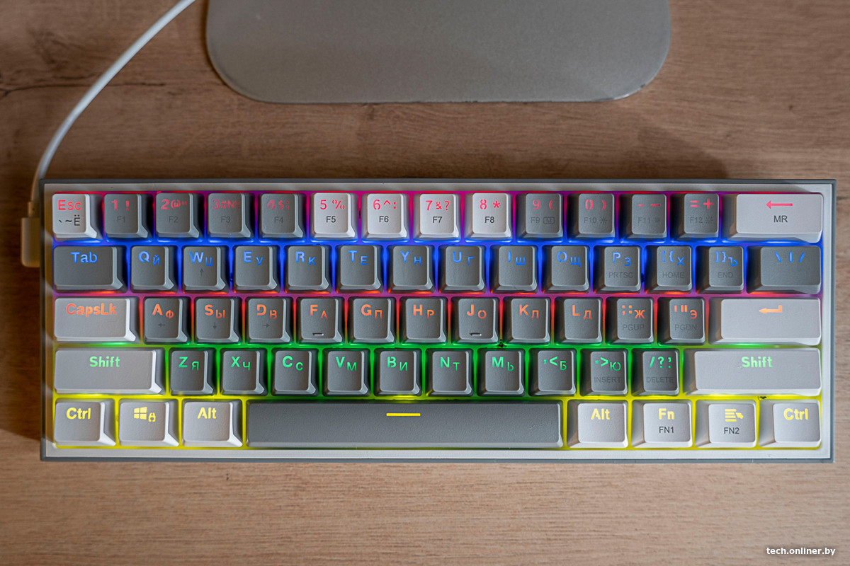 Redragon Ryze выполнена в форм-факторе 65%. Она шире, чем Fizz, и имеет несколько дополнительных клавиш. На месте, где обычно расположена клавиша «ё» на клавиатуре, находится Esc, а сама буква перенесена к блоку дополнительных клавиш справа. Устройство оснащено регулируемой RGB-подсветкой. Профиль клавиатуры тоже изменился: расстояние от стола до поверхности клавиши Enter составляет 27 мм в сложенном виде и 31 мм с выдвинутыми ножками.