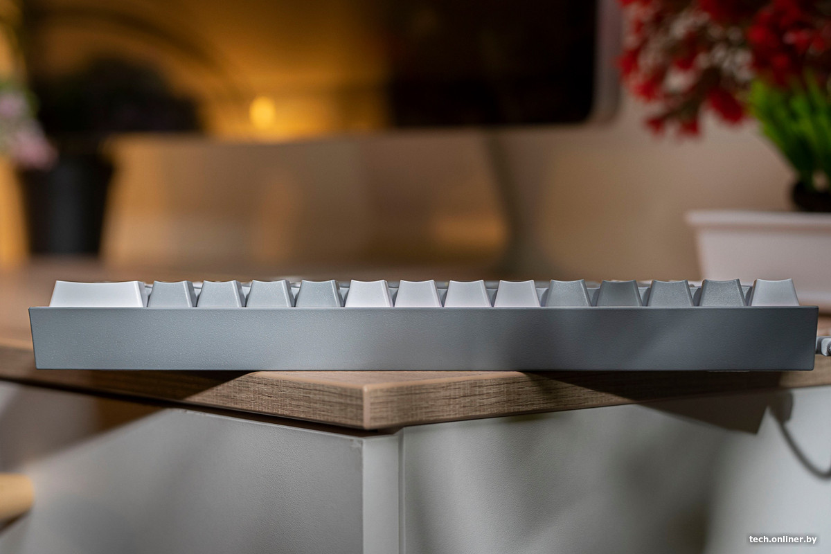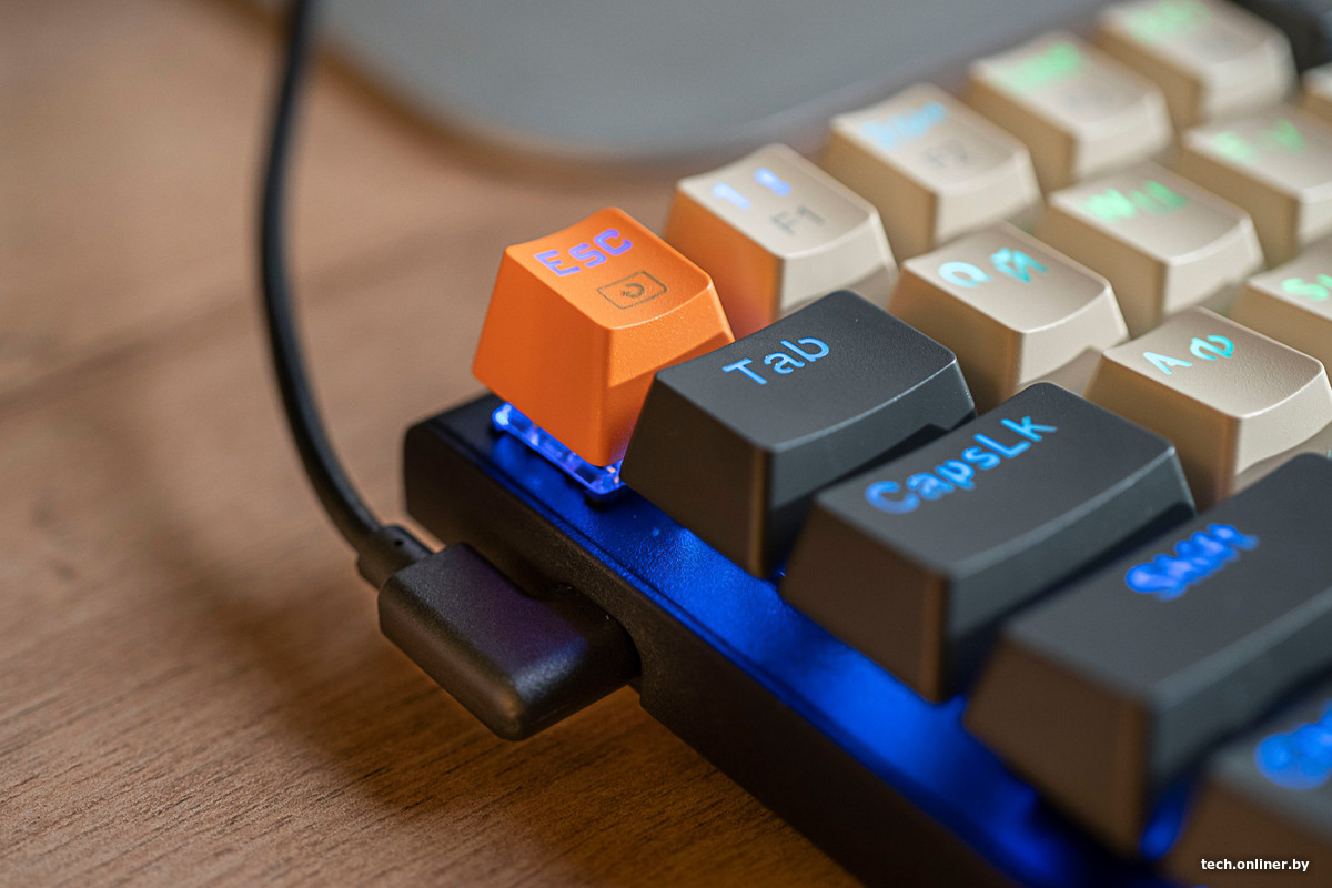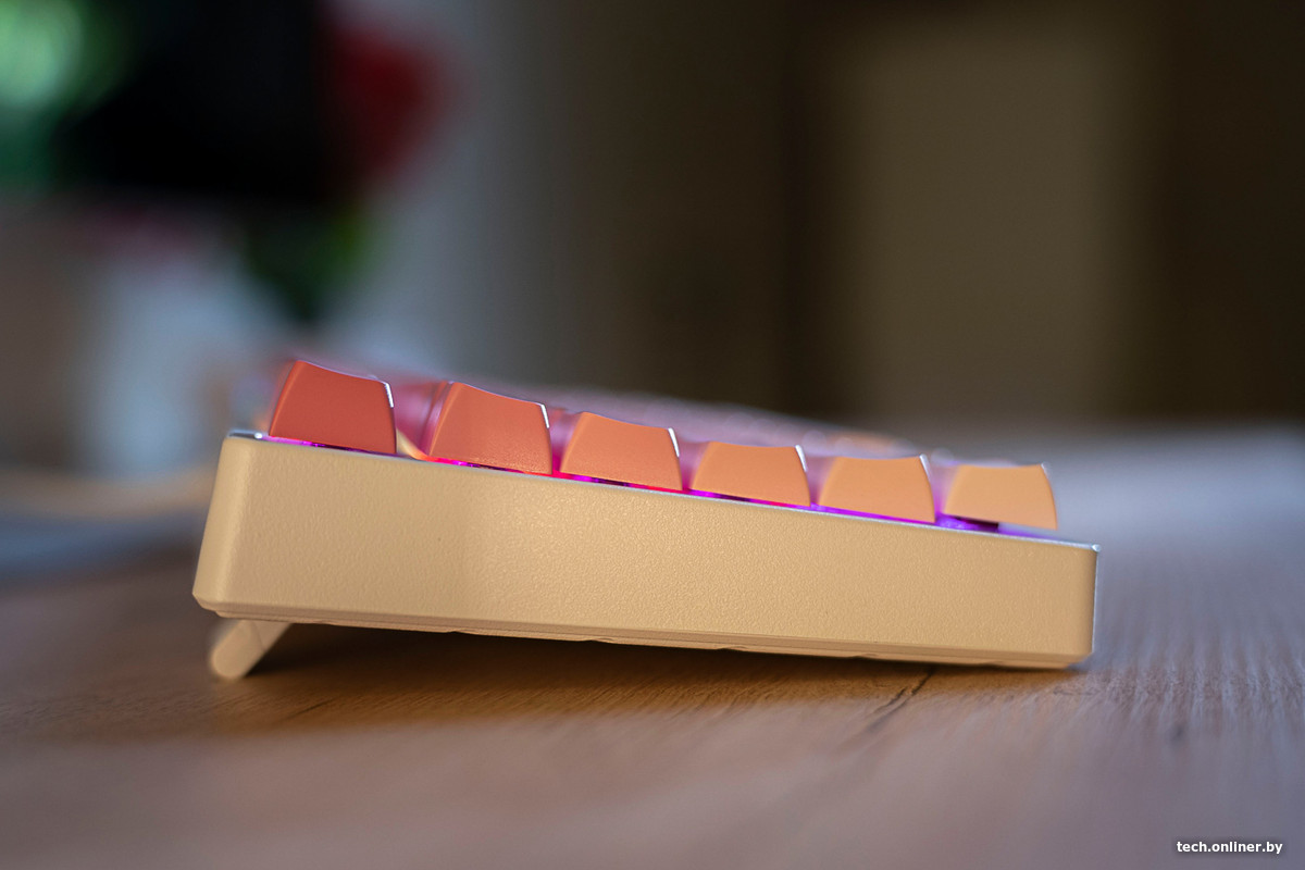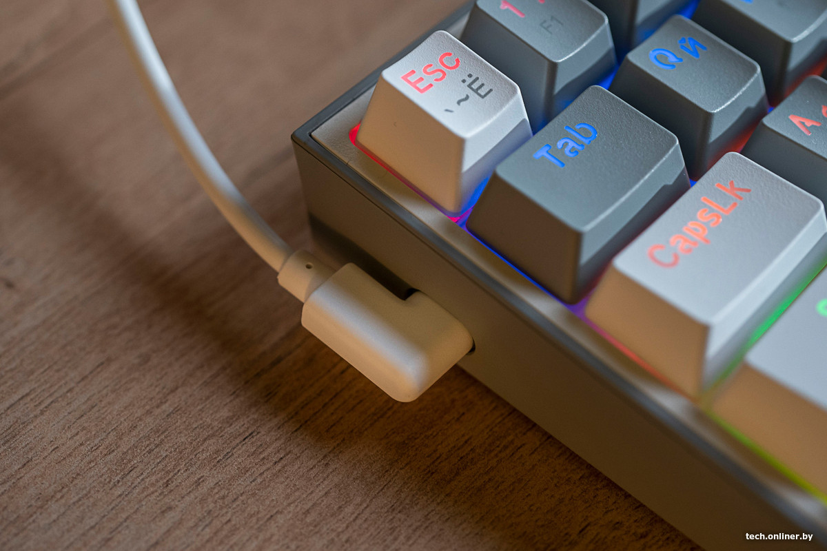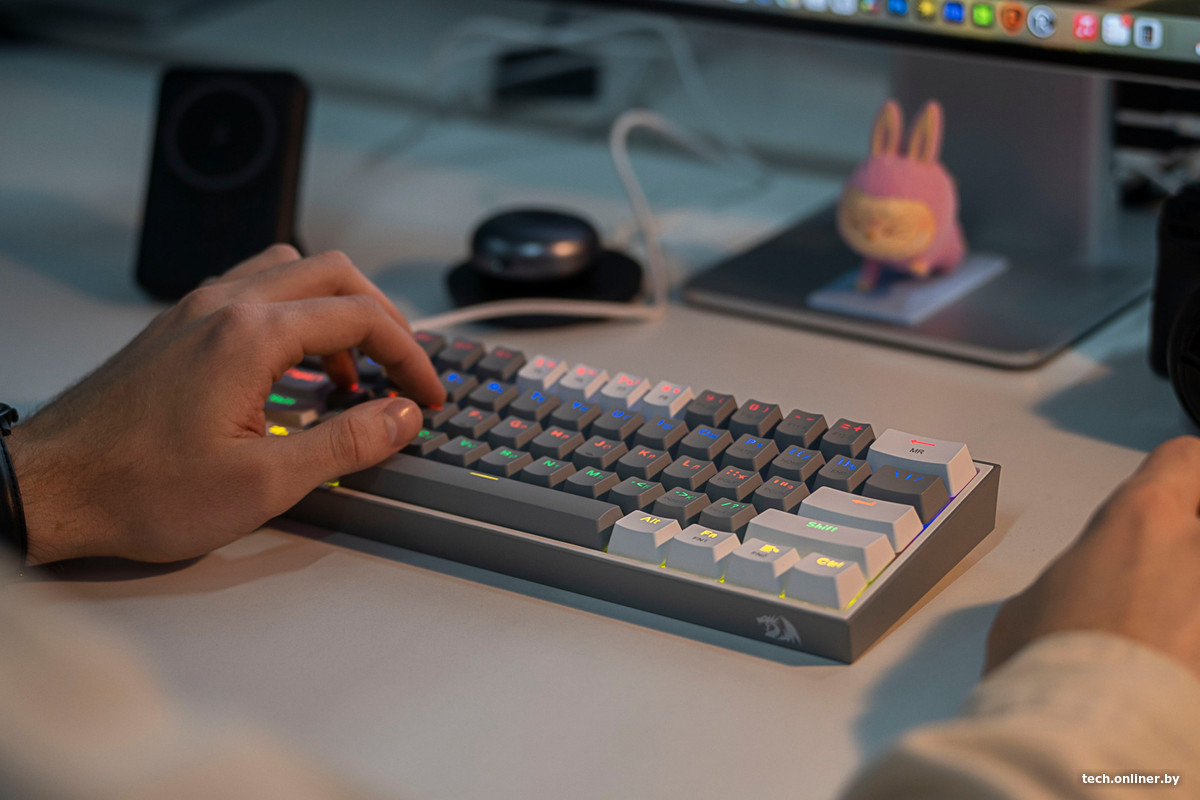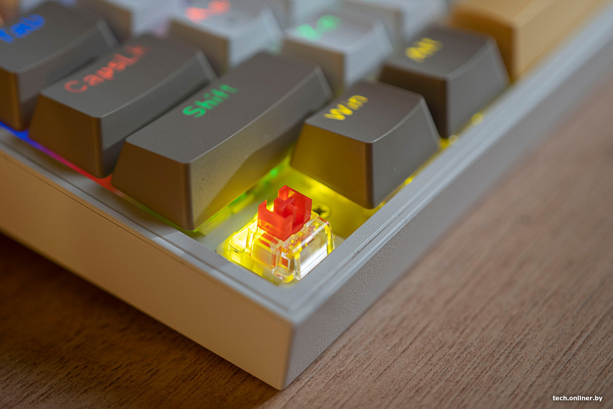 Redragon Ryze выполнена в форм-факторе 65%. Она шире, чем Fizz, и имеет несколько дополнительных клавиш. На месте, где обычно расположена клавиша «ё» на клавиатуре, находится Esc, а сама буква перенесена к блоку дополнительных клавиш справа. Устройство оснащено регулируемой RGB-подсветкой. Профиль клавиатуры тоже изменился: расстояние от стола до поверхности клавиши Enter составляет 27 мм в сложенном виде и 31 мм с выдвинутыми ножками.