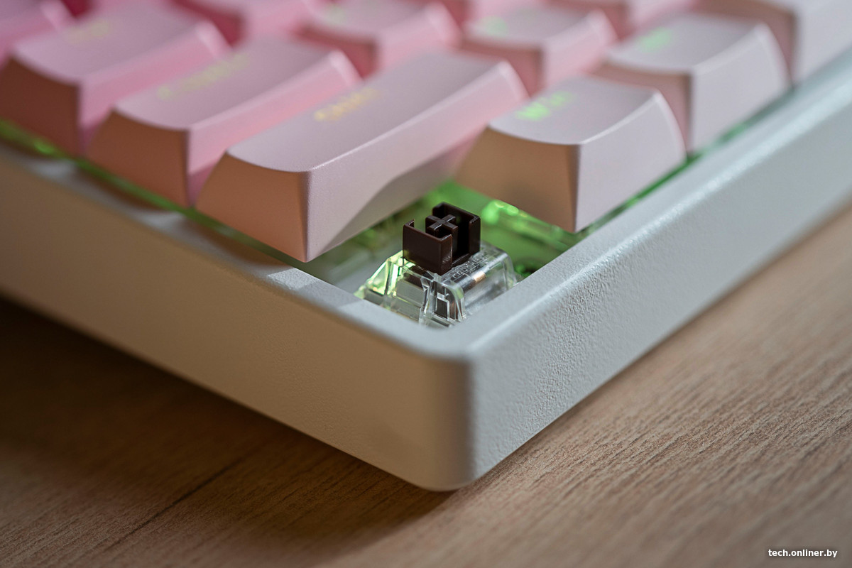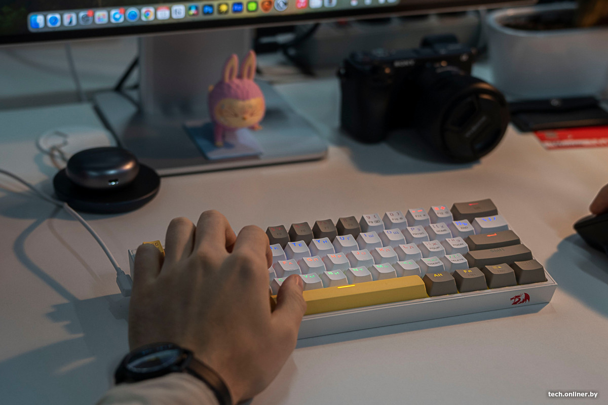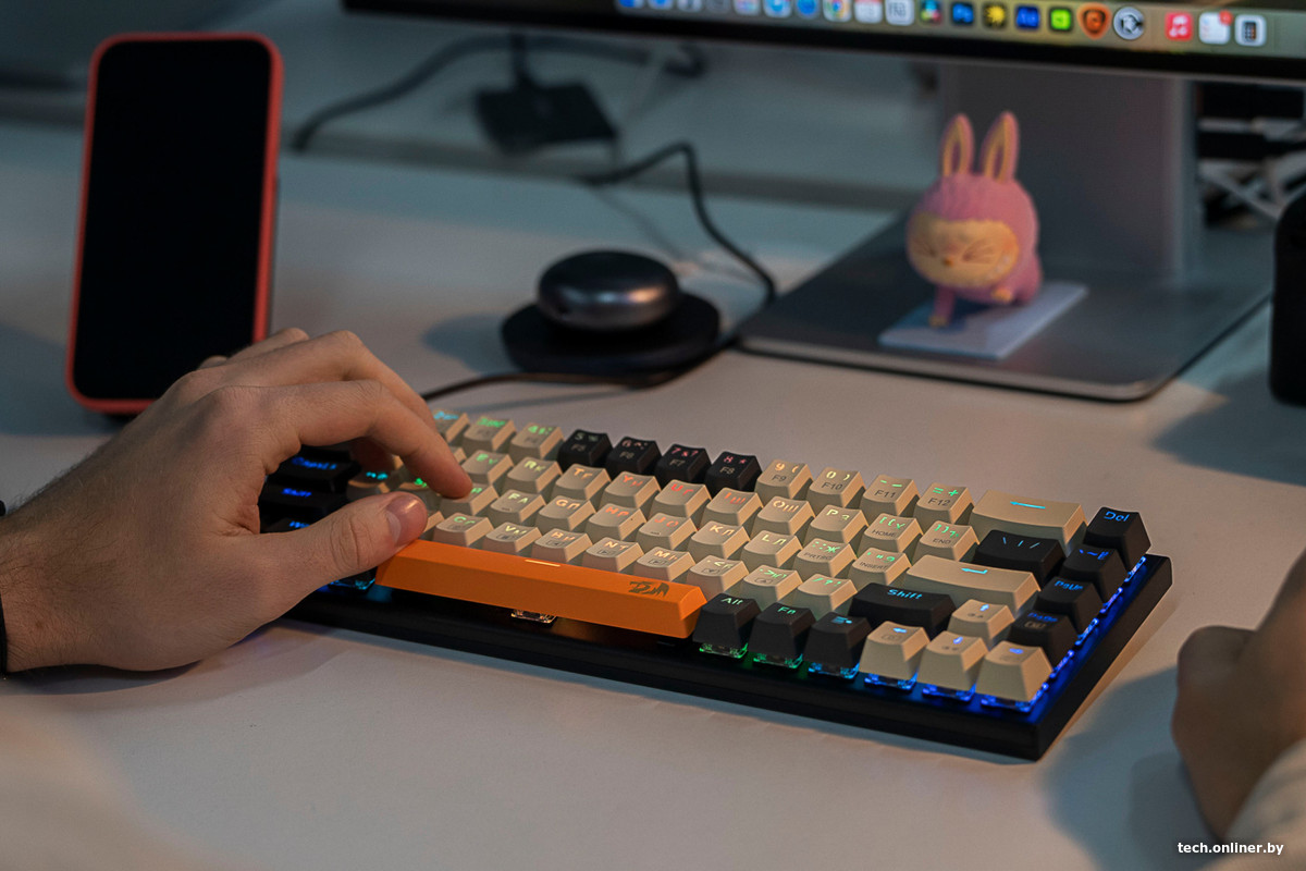 В Redragon Fizz со свитчами Melt-Gold ход клавиш кажется излишне тугим, нажатия ощущаются слегка деревянными. Звук звонкий, громкость средняя, тон уходит в более высокие оттенки.