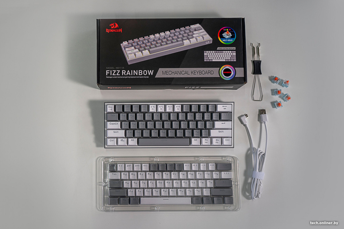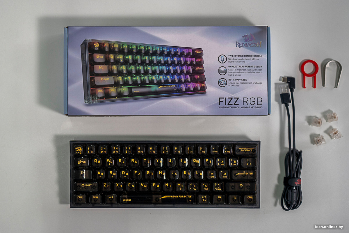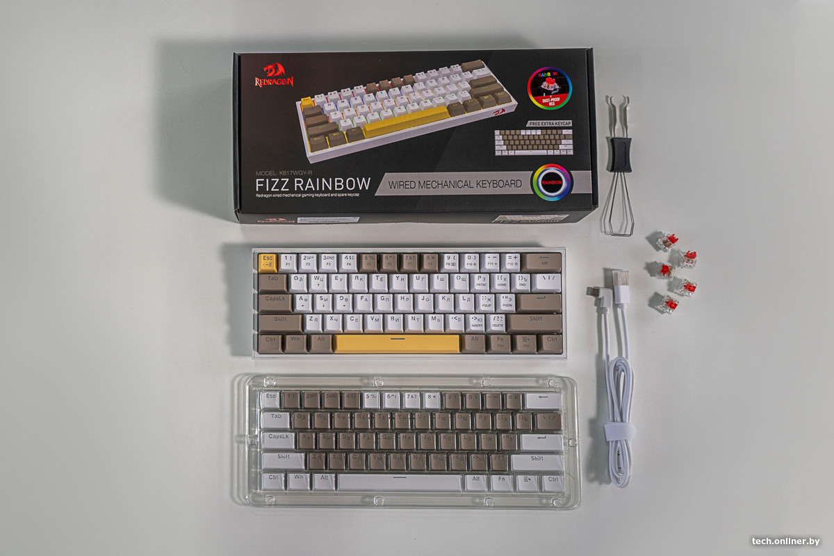 Комплектация Redragon Fizz отличается в зависимости от установленных на заводе переключателей: меняется тип пуллера для их замены и набор сменных клавиш.
