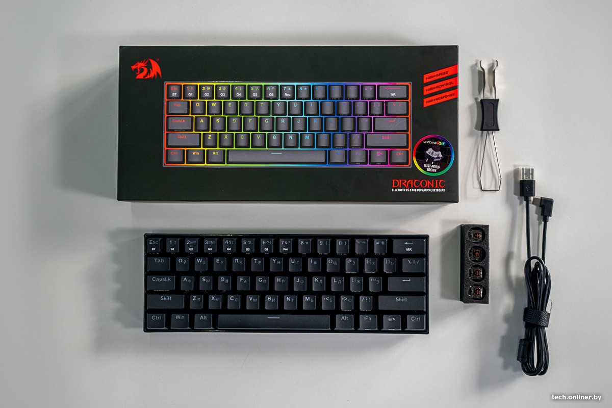 С точки зрения габаритов и дизайна Redragon Draconic повторяет Lakshmi. Главное отличие — возможность беспроводного подключения: можно подключить до трех устройств по Bluetooth. Интересно выполнено и нанесение альтернативных функций — символы расположены на боковой стенке клавиши, а не сверху. Подсветка клавиш — регулируемая RGB.