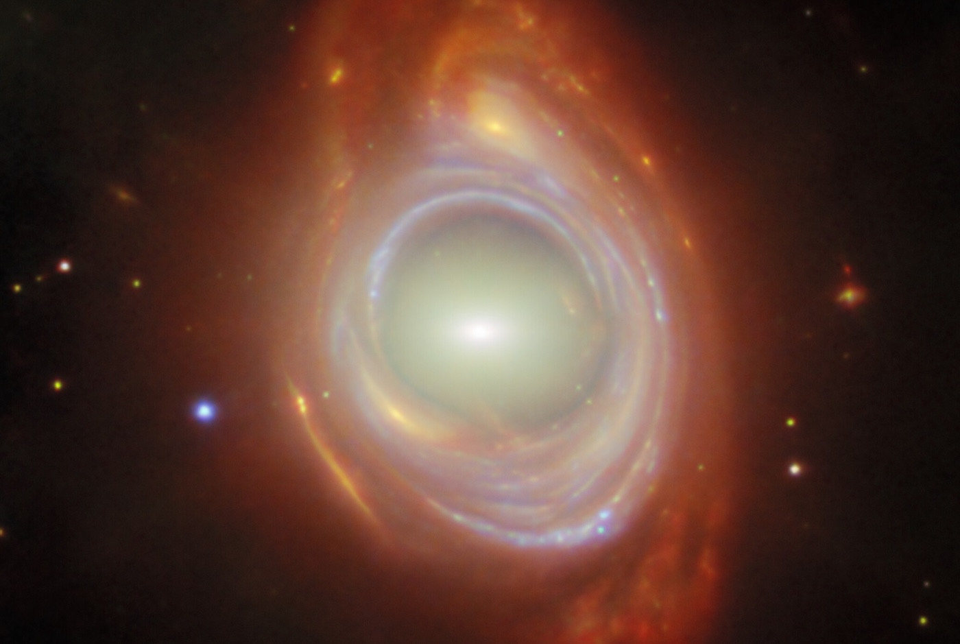 На этом снимке запечатлено редкое космическое явление, называемое кольцом Эйнштейна. То, что на первый взгляд кажется одной галактикой со странной формой, на самом деле представляет собой две галактики, разделенные большим расстоянием. Более близкая галактика на переднем плане находится в центре изображения, а более удаленная на заднем плане будто обвивается вокруг первой, образуя кольцо.