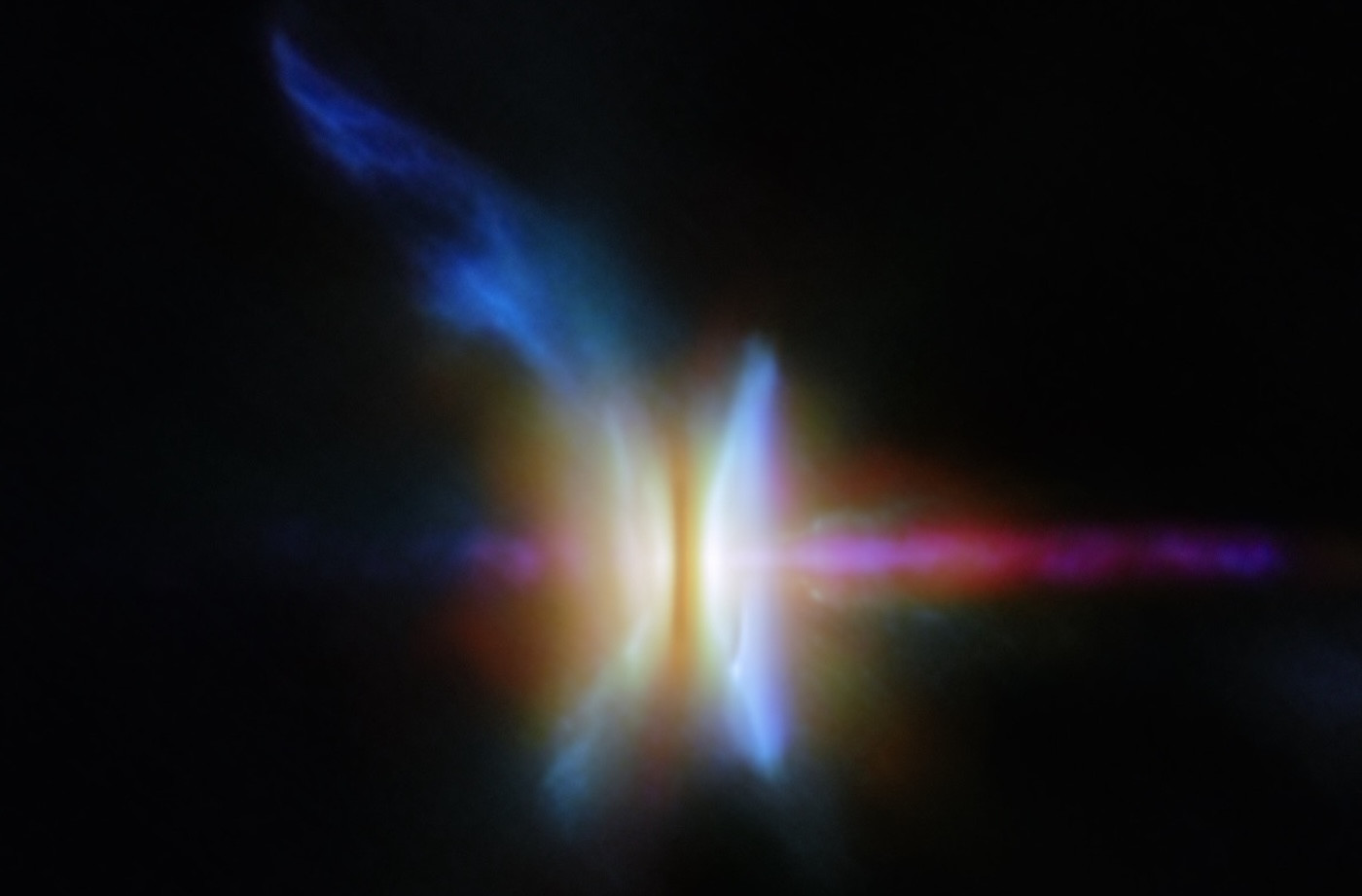 Нет, это не выстрел из гигантского космического бластера и даже не инопланетная антенна. Это протопланетный диск, наблюдаемый с ребра, окруженный джетами и дисковым ветром. В этой небольшой туманности газ вытекает из молодой звезды, нагревается ударными волнами и превращается в свечение. На изображении пример того, где этот вытекающий газ принимает форму узкой струи. Звезда-источник расположена на одном конце этой линии и скрыта за протопланетным диском, который она освещает.