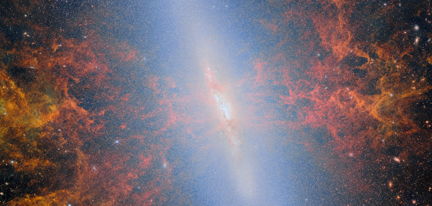 Галактика M82 (или Галактика Сигара) расположена всего в 12 миллионах световых лет от нас в созвездии Большой Медведицы. Несмотря на то что M82 меньше Млечного Пути, она в пять раз ярче нашей галактики и в десять раз быстрее образует звезды. Камера ближнего инфракрасного диапазона телескопа «Джеймс Уэбб» позволила увидеть великолепие центра Галактики Сигара.