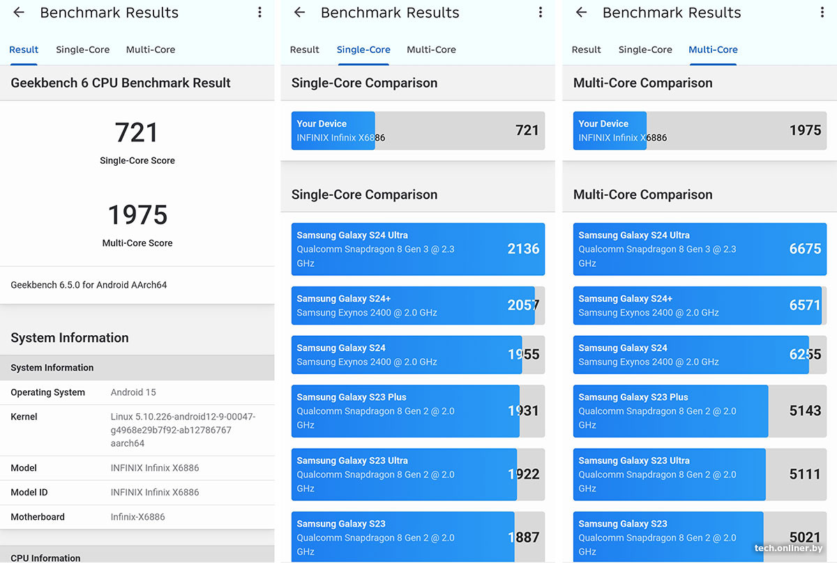 В синтетическом тесте Geekbench мобильник набрал немного, а с AnTuTu «дружить» не захотел. В тесте на троттлинг смартфон Infinix показал стабильную работу на приближенной к максимальной частоте без заметных провалов и оставаясь при этом лишь теплым.