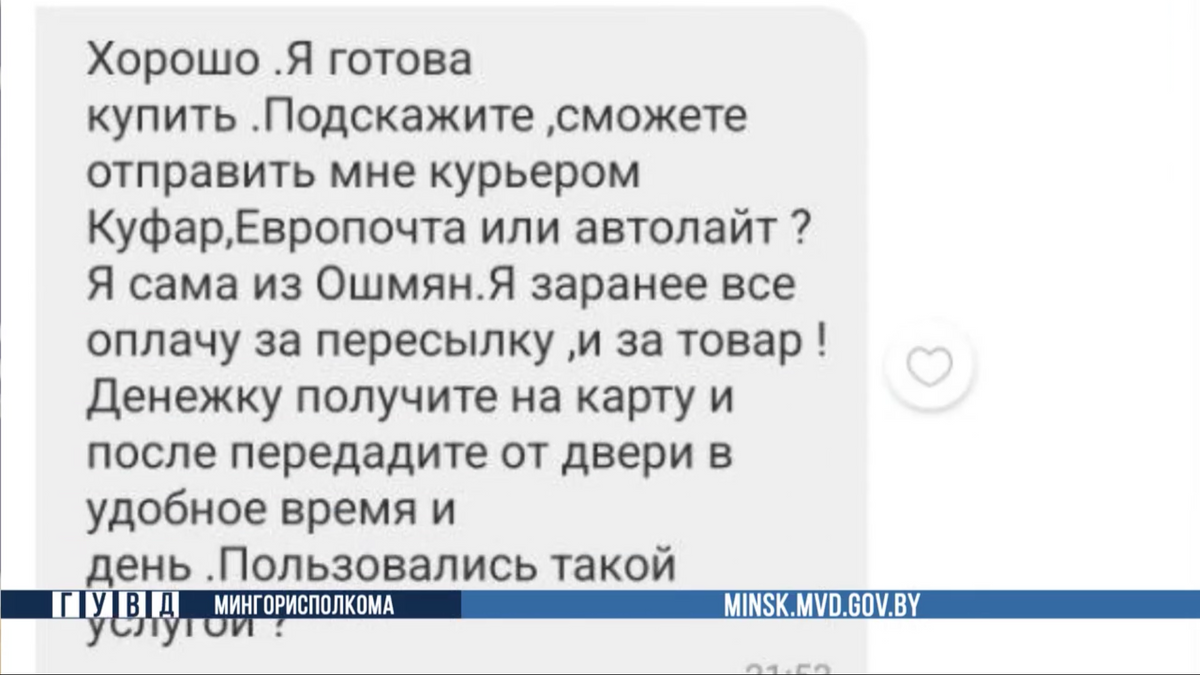 Минчанин разместил объявление на популярной онлайн-площадке, и вскоре ему написала потенциальная покупательница. В переписке девушка предложила оформить доставку, так как она живет в другом городе: «Денежку получите на карту и после передадите от двери в удобное время и день», — уверяла она продавца.