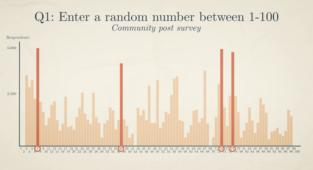 Авторы канала Veritasium пошли еще дальше — они провели, как утверждают, самый большой онлайн-опрос по случайным числам, в котором поучаствовало более 200 тыс. человек. Как и в случае с гораздо меньшим по масштабу опросом на Reddit, победителем оказалось число 69. Удивительно, но в живом опросе с респондентами с улицы число 69 и близко не было в числе фаворитов, а через интернет люди чаще других выбирали именно его. Можно предположить, что причина кроется в анонимности, и далеко не факт, что многие из тех, кто онлайн ответил 69, ответили бы так же при встрече, так как в социуме у числа явный сексуализированный окрас.