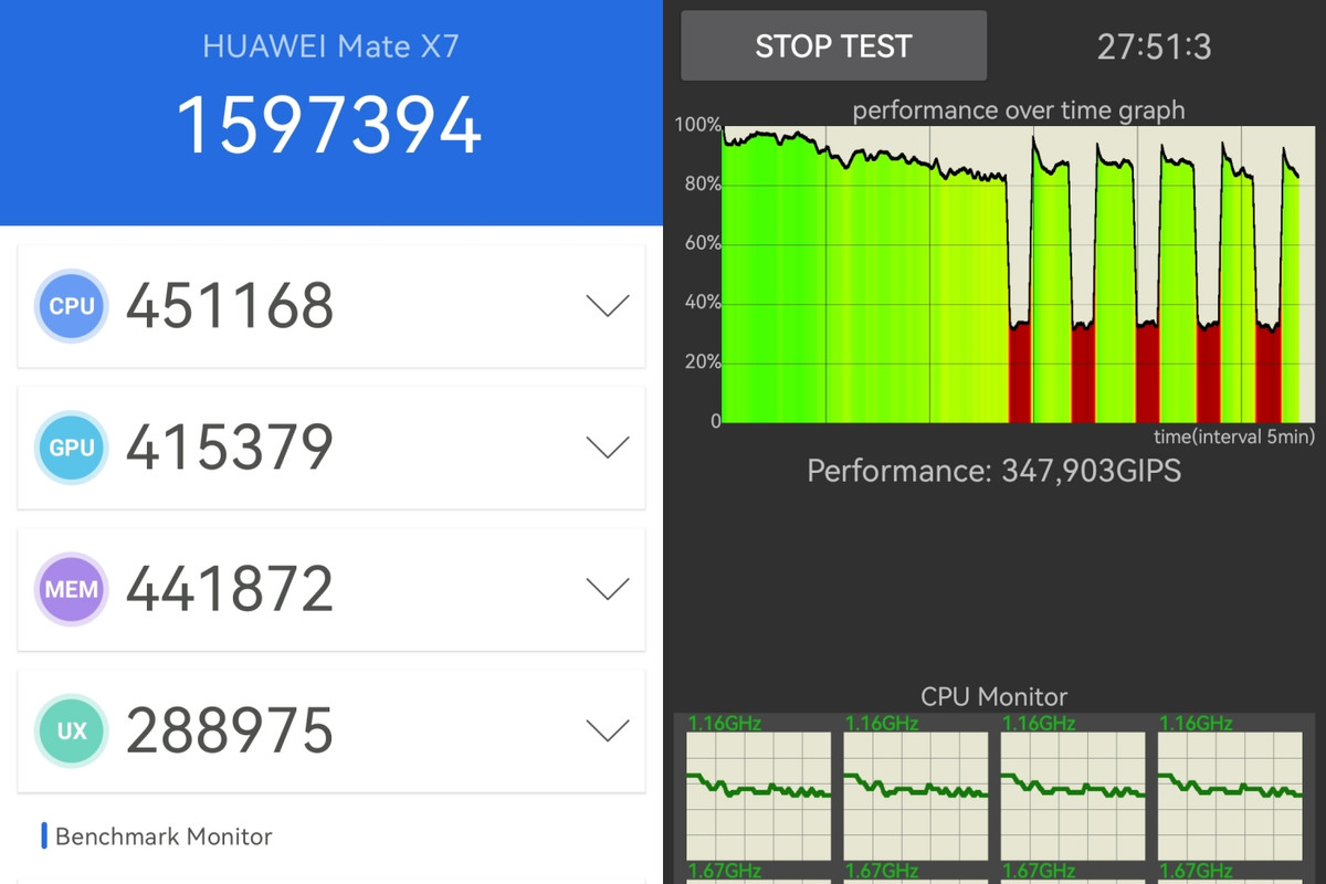 В целом картина такая: Mate X7 по «чистой» производительности соответствует скорее субфлагманским смартфонам. Разрыв с топовыми чипами (и аппаратами, в которых они применяются) не сокращается, но и не растет.