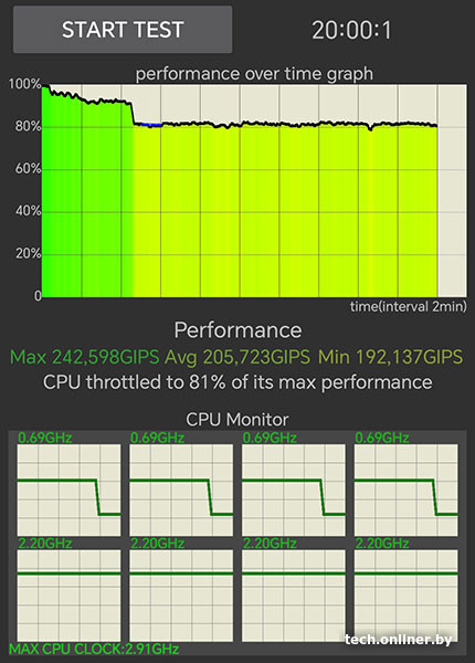 Как во время синтетических тестов, так и во время игр смартфон нагревался, но лишь до уровня «теплый». Вероятно, тому способствует и объемный внутри корпус, эффективно рассеивающий энергию.