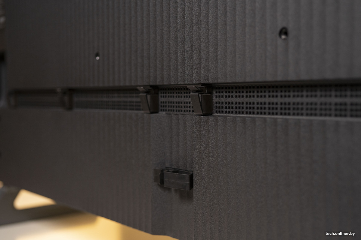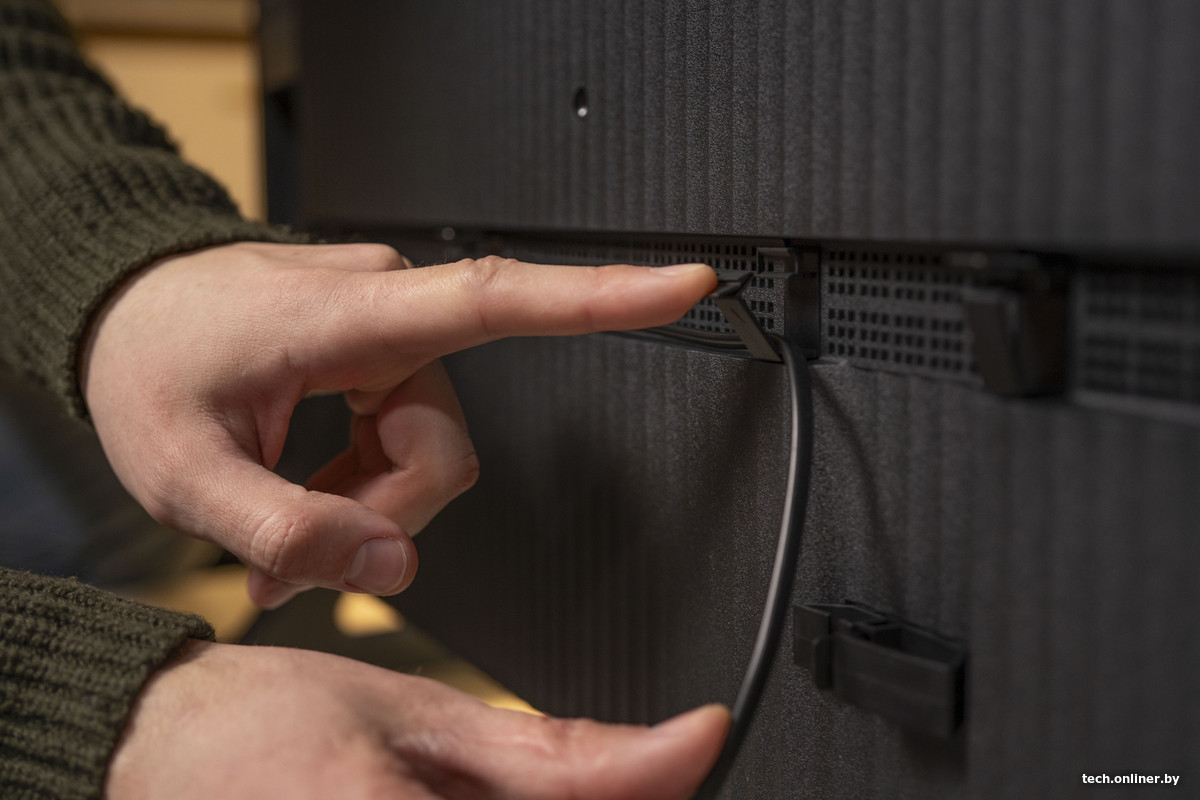 Появился кабель-канал с зажимами для укладки кабеля питания и всех остальных подключаемых источников. Очень простая, но достаточно полезная опция, чтобы все кабели аккуратно были спрятаны за ТВ и не болтались вразнобой при выходе за его пределы.