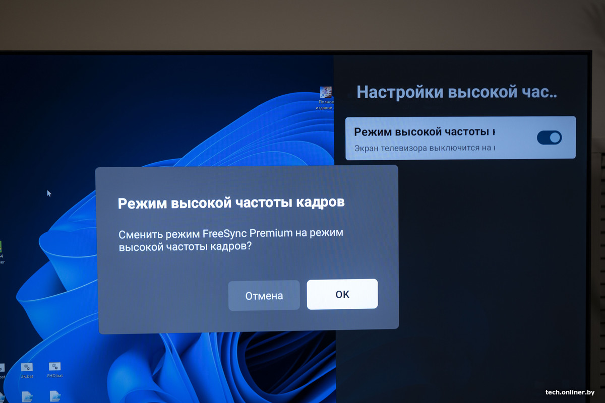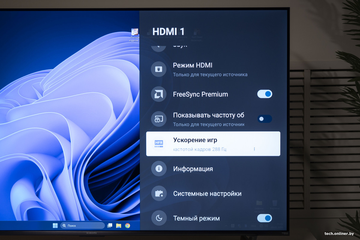 В игровом меню также есть опция со странным названием «Ускорение игр» и иконкой HFR. Нет, эта опция не прибавляет fps в играх, а отвечает за увеличение частоты экрана до 288 Гц, жертвуя максимальным разрешением. Если объяснять просто, при ее активации телевизор ускоряет время обновления дисплея в два раза, позволяя достигать таких высоких частот. Пропускной способности HDMI 2.1 не хватает, чтобы все это работало в максимальном 4K-разрешении, поэтому автоматически выставляется 2560×1440. Страдает также глубина цвета — максимум 8 бит вместо 10.