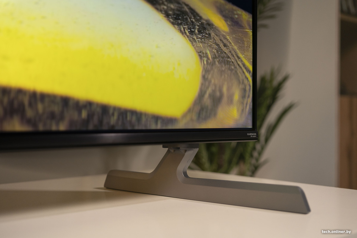 Первое, что бросается в глаза в сравнении с моделью 2025 года, — другие подножки. Теперь они касаются поверхности по всей своей длине и смещены вперед, вероятно, для предотвращения падения телевизора. При попытке раскачать телевизор рукой подножки стоят уверенно, совершенно не двигаются.