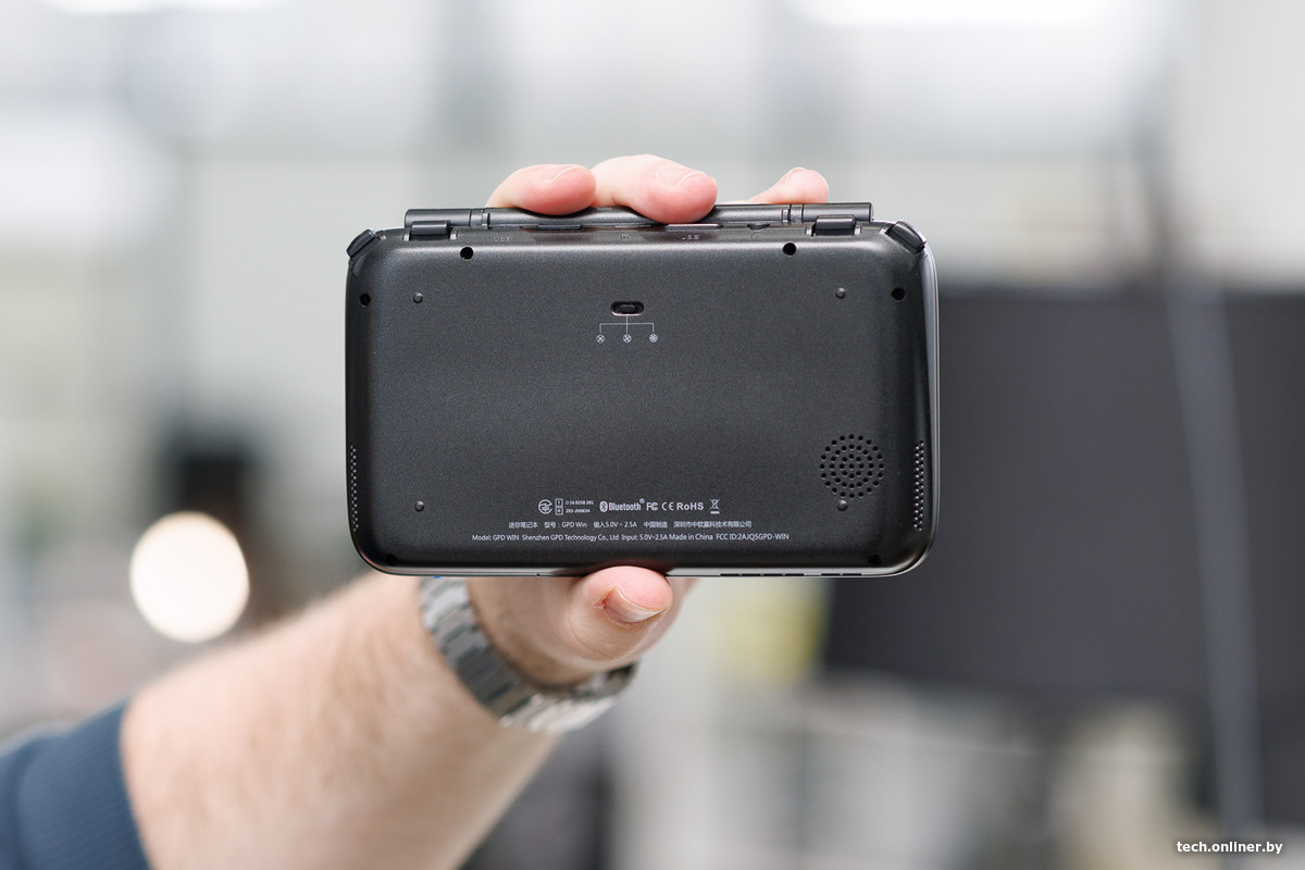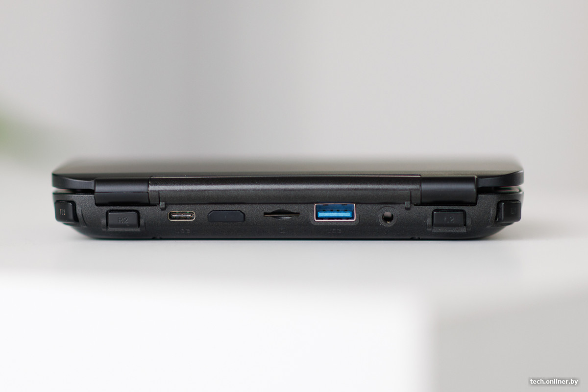 — К плюсам компьютера можно отнести его компактность и относительно неплохую для такого размера мощность. Дисплей достаточно яркий, набор разъемов с тыльной стороны — широкий. Отметим USB-C, по которому Win заряжается. На те времена само наличие Type-C уже вызывало уважение. Рядом — слот для карт памяти, а также mini HDMI — через него девайс можно было подсоединить к внешнему монитору.