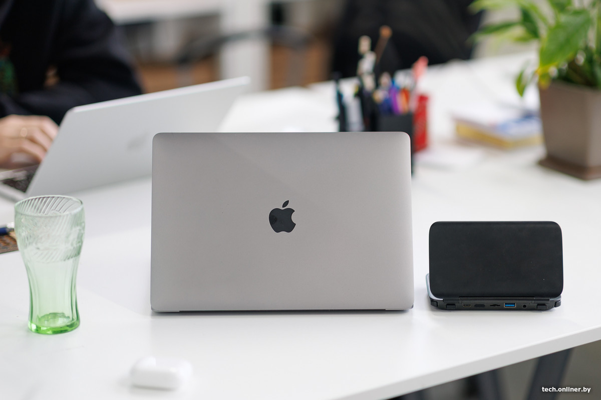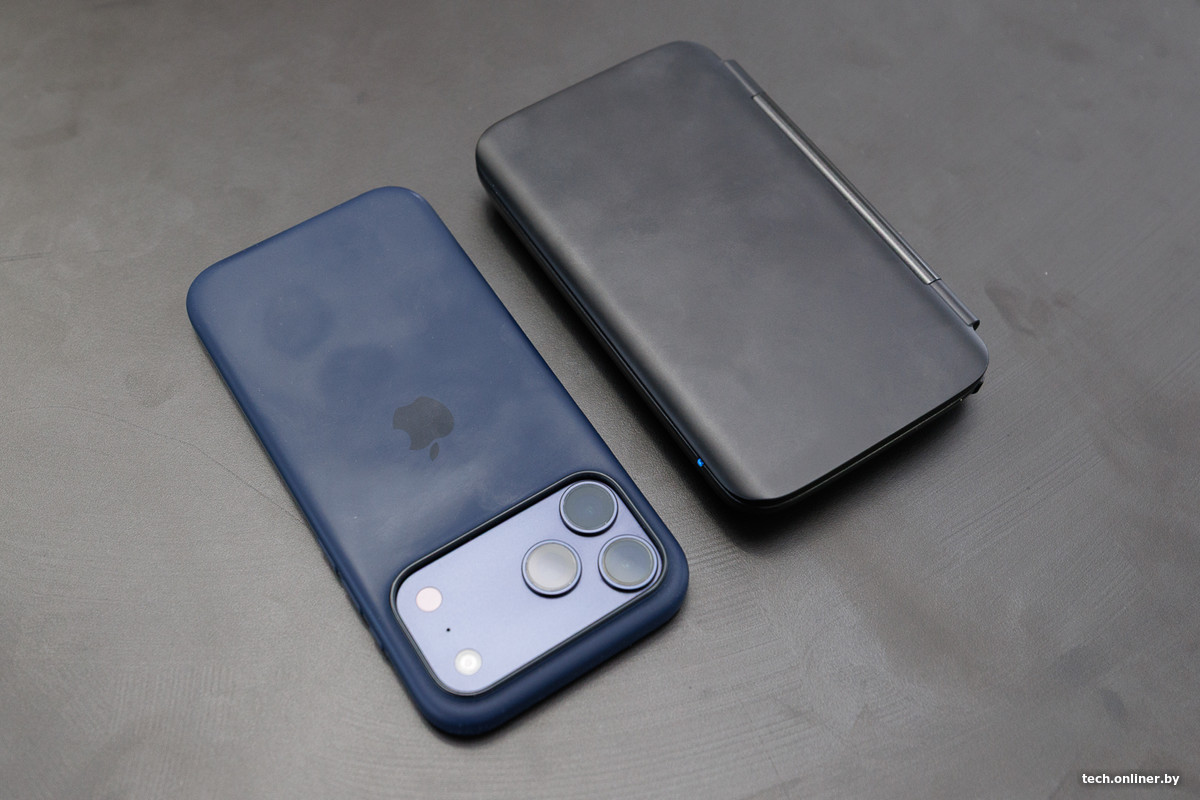 В характеристиках заявляется: устройство весит 365 граммов и по толщине составляет 22 мм. На фото ниже, для сравнения, «портативка» находится рядом со смартфоном iPhone 17 Pro Max толщиной 8,8 мм. Личные ощущения: учитывая год выпуска, назвать мини-ноутбук объемным для своего формфактора не выходит. Он, пускай и с натяжкой, но помещается в передний карман джинсов, однако сесть с ним уже не получится — и тем не менее.