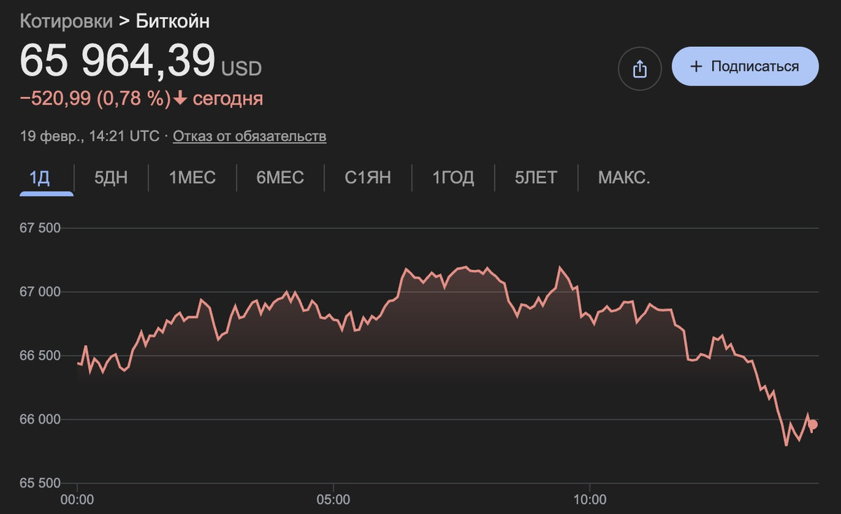 Напомним: неделю назад, 11 февраля, курс «монеты» опускался ниже отметки в $67 тысяч. И в целом: биткоин переживает относительно нестабильные времена — криптовалюта потеряла более чем 57% стоимости по сравнению с рекордом, достигнутым в октябре 2025 года. Тогда 1 BTC стоил больше $124 тысяч.