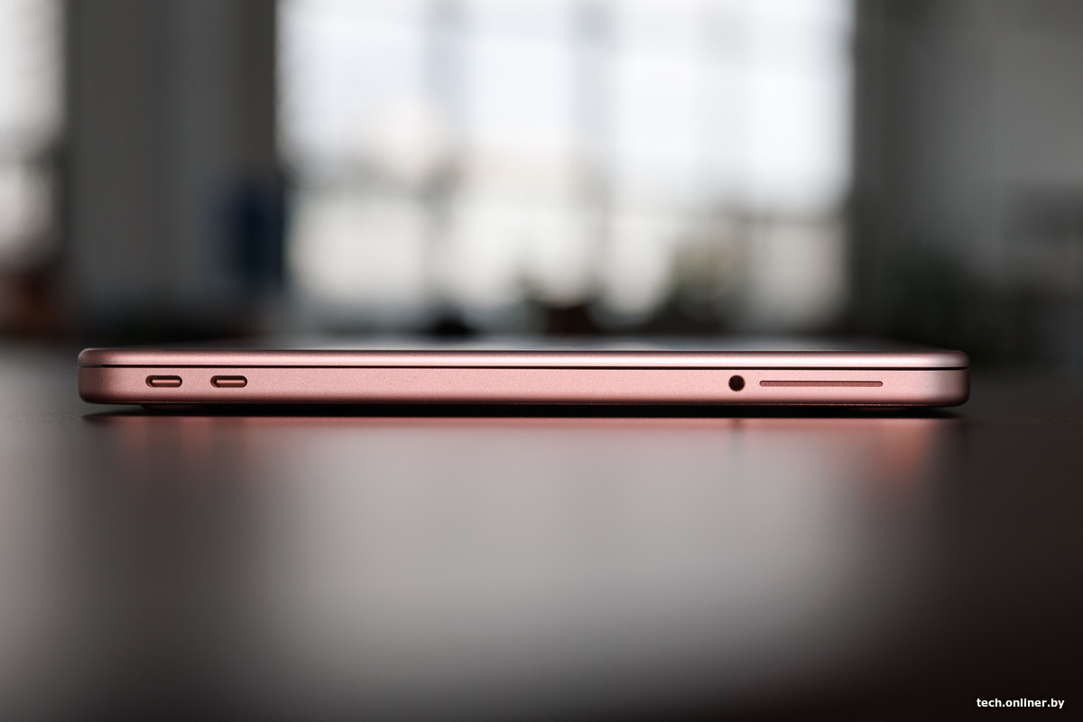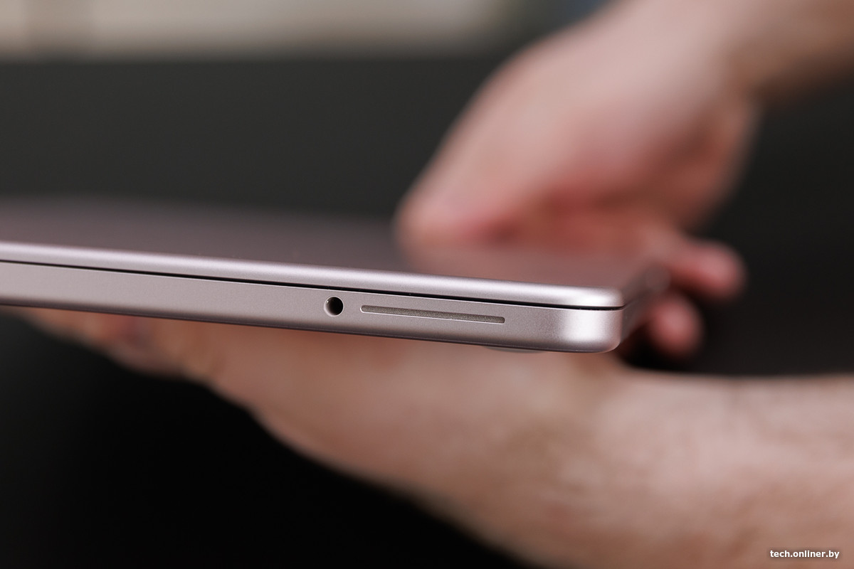 Среди относительно нетипичных для ноутбуков Apple решений — стереодинамики. Их решили разместить не фронтально (как на «прошках», рядом с клавиатурой) и не под экраном (как на Air), а по бокам — слева и справа.