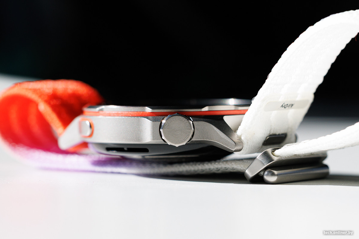 Низ корпуса со стандартом защиты IP69 покрыт композитным материалом, верх — закаленным стеклом. Всего тут разместили две кнопки: колесико digital crown, необходимое для выбора функций и навигации, и плоскую клавишу, которая при нажатии активирует заранее выбранную опцию в солидном списке навыков новинки.