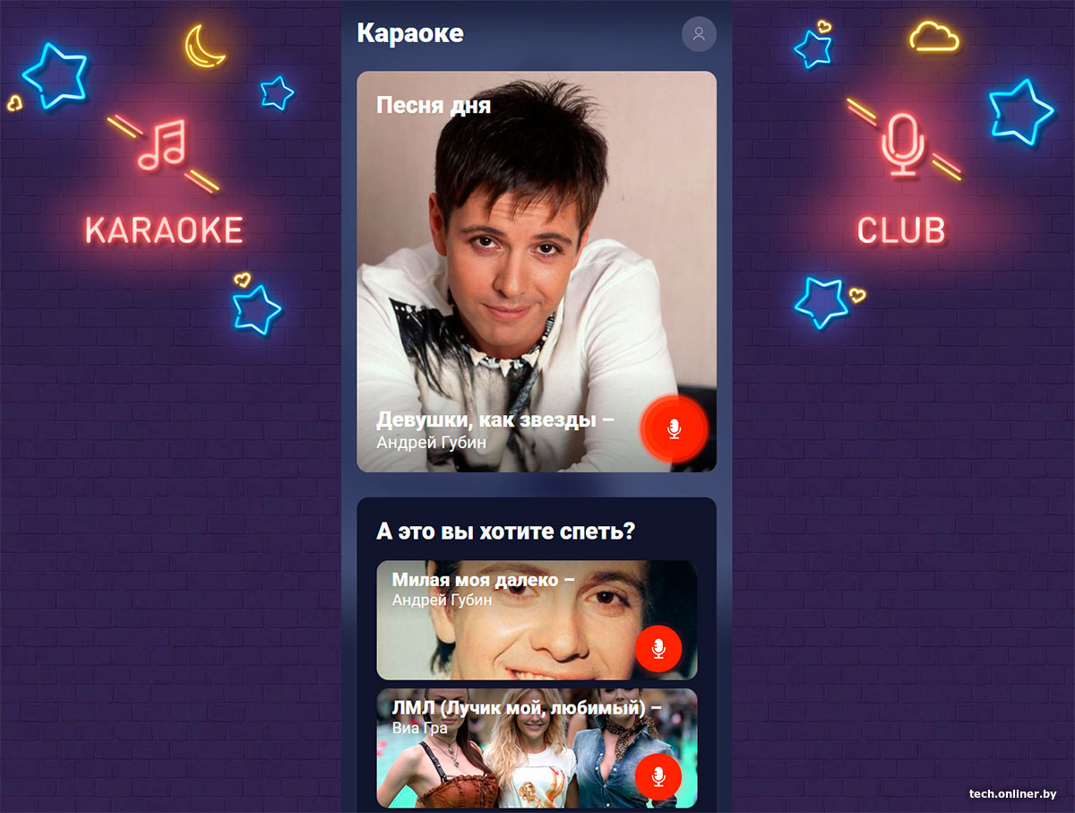 Как следует из описания, «„Караоке“ — развлекательный сервис, который предлагает исполнять песни и делать аудиозаписи ваших исполнений под проигрываемую фонограмму». Далее можно делиться записями, слушать и сохранять их.