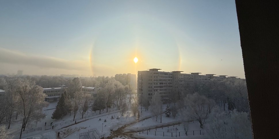 На фоне необычно снежной зимы и морозной погоды появилось нечто еще более неожиданное для января — солнце. Да не просто появилось, а вместе с красивым и редким явлением — солнечным гало. Такое свечение возникло из-за сочетания морозной погоды, повышенной влажности и перистых облаков не слишком большой плотности.