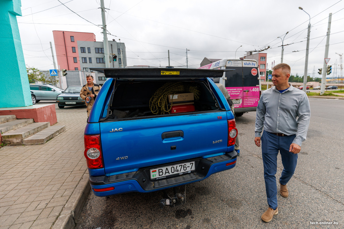 Затем мы со специалистами выехали по поступившей заявке на базовую станцию в соседний район, на улицу Есенина. Рабочая машина инженеров — полноприводный джип JAC, чтобы можно было проезжать в труднодоступных местах при работе за городом. Здесь на диспетчерской станции «Малиновка-4» размещена вышка сотовой связи, на которой необходимо заменить передатчик для радиорелейной антенны, он же outdoor unit.