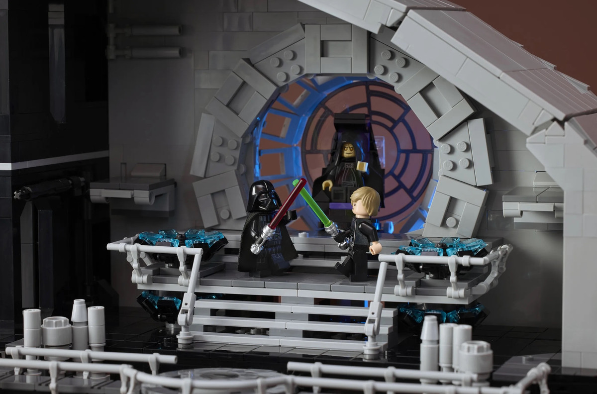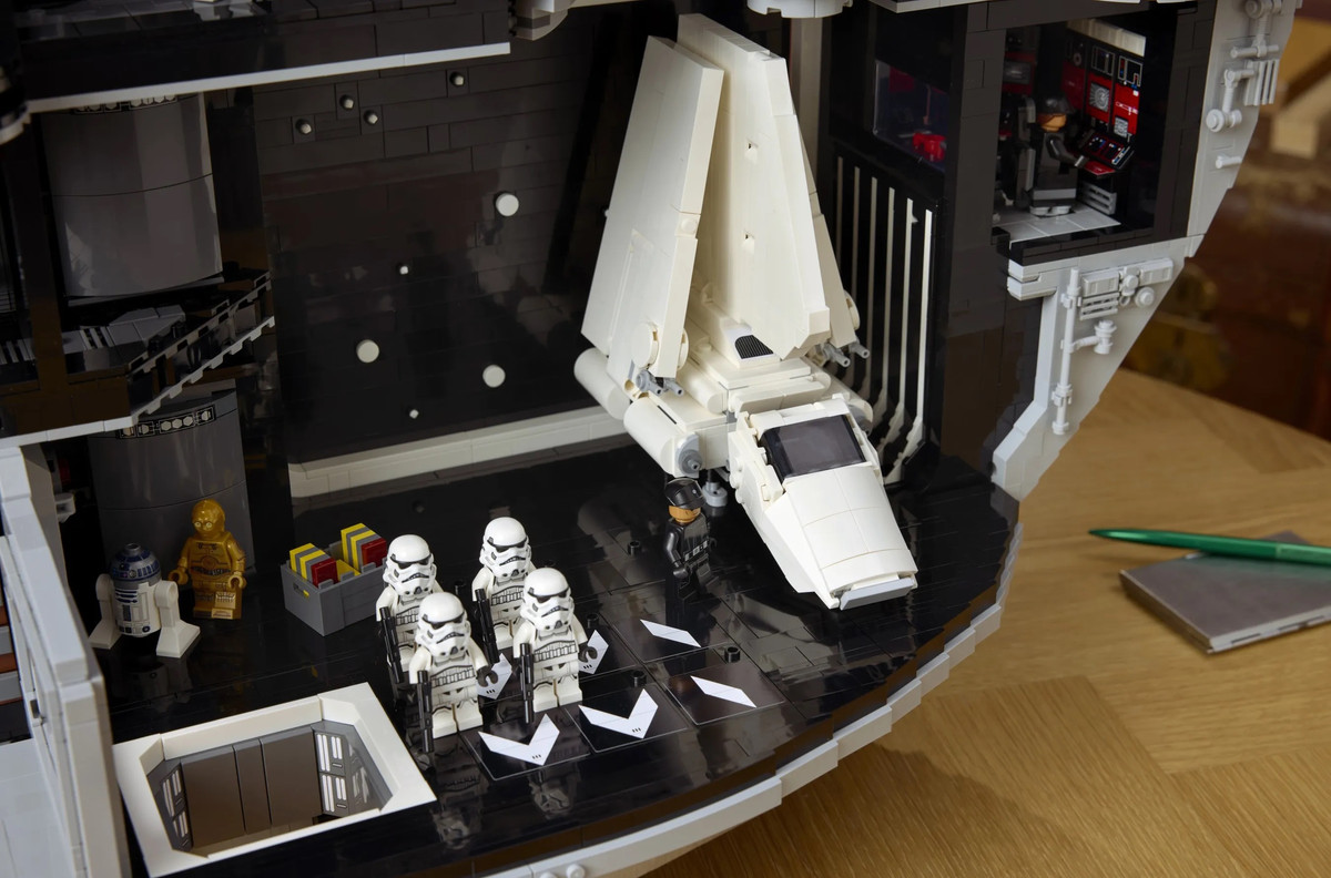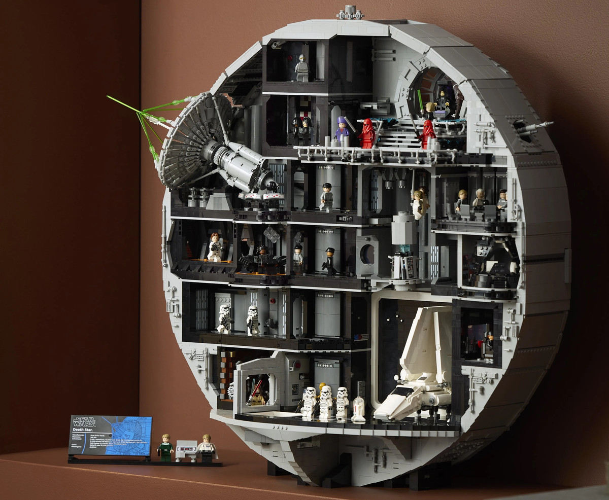 Это тщательно детализированная «Звезда смерти» высотой 70 см, шириной 80 см и глубиной почти 27 см. В наборе 9023 детали и 38 фигурок с персонажами саги. В модели есть несколько отсеков, где воссозданы знаковые сцены с участием «Звезды смерти» в фильмах «Звездные войны» — например, камера заключения принцессы Леи, тронный зал императора Палпатина и центр управления ангаром, куда проникли Люк Скайуокер и Хан Соло.