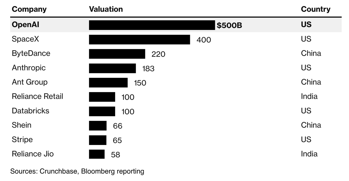 Американская OpenAI — разработчик СhatGPT — стала самой дорогой частной компанией в мире, сообщает Bloomberg. Теперь стартап оценивается в $500 миллиардов, что позволило обойти ракетостроительную компанию SpaceX Илона Маска, которая стоит $400 миллиардов.