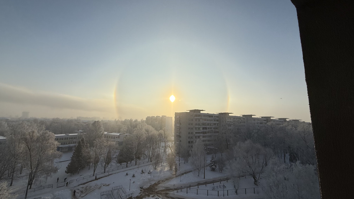 На фоне необычно снежной зимы и морозной погоды появилось нечто еще более неожиданное для января — солнце. Да не просто появилось, а вместе с красивым и редким явлением — солнечным гало. Такое свечение возникло из-за сочетания морозной погоды, повышенной влажности и перистых облаков не слишком большой плотности.