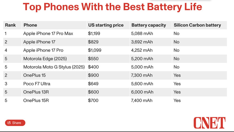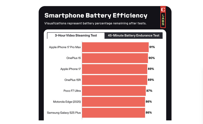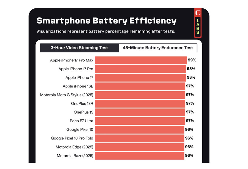 В итоге победителем и в первом, и во втором тесте оказался iPhone 17 Pro Max. Также в пятерку лидеров в рамках трехчасового теста вошли OnePlus 15, iPhone 17, OnePlus 15R и Poco F7 Ultra. А в 45-минутном тесте после iPhone 17 Pro Max расположились iPhone 17 Pro, iPhone 17, iPhone 16e и Motorola Moto G Stylus.
