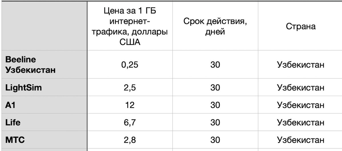 У белорусских операторов, если рассматривать варианты со схожим объемом трафика, нашлись пакеты на 3 ГБ (А1, Life) и 5 ГБ (МТС), которые работают в Узбекистане — они, соответственно, оценены в 109, 59,9 и 44 рубля (порядка $36, $20 и $14 по курсу).