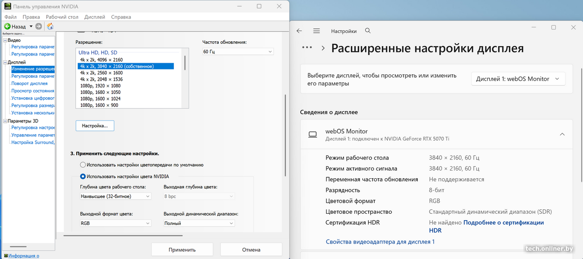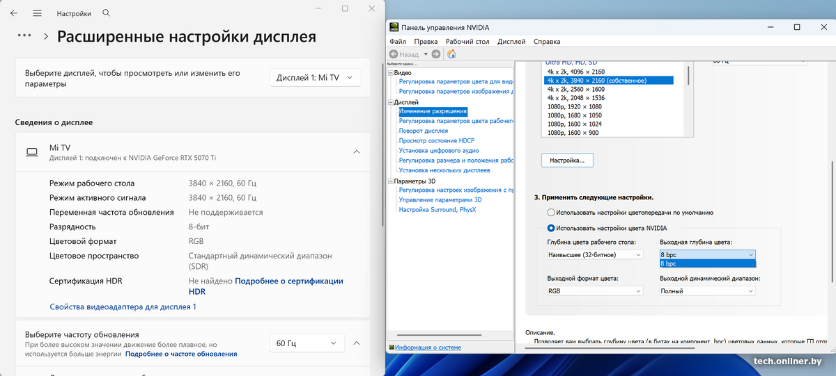 Кроме этого, только с TCL в настройках панели NVIDIA можно было активировать глубину цвета 12 бит. Это одна из особенностей телевизоров с Dolby Vision, для работы которого контроллер должен сообщить о поддержке 12-битного сигнала. По факту в нем используется матрица 8 бит + технология FRC для эмуляции 10-битной глубины, а панели Xiaomi TV A Pro 55" 2026 и Roome 55VU424QW имеют только 8 бит. Проще говоря, как минимум при подключении ПК больше всего оттенков покажет TCL 55P7K.